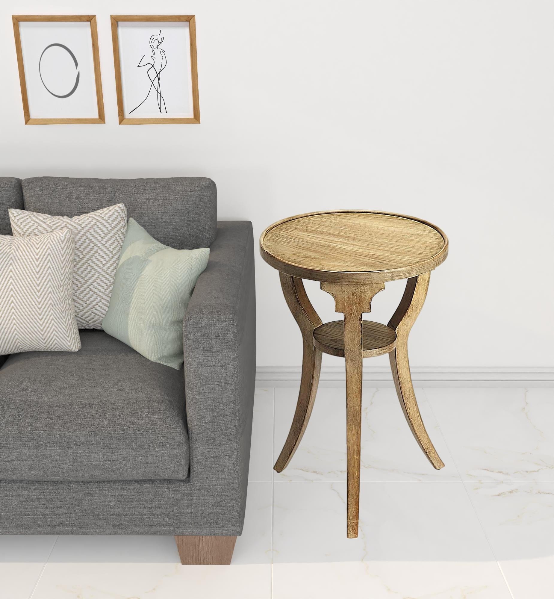 Optimize your space and add some charm to your room with the 24" gray and driftwood manufactured wood round end table with shelf. A gray solid wood frame is finished off with a driftwood manufactured wood top that is the epitome of quality construction and design. Complete with a purposefully distressed finish, this table has an aged, vintage, and rustic feel. Includes a single shelf for handy storage or display space. An ideal location for placing your snacks and drinks, and a place to keep your lamp, frames, or other accessories. This versatile table is a great accent for most any room. 24.25" H x 15.75" W x 15.75" D