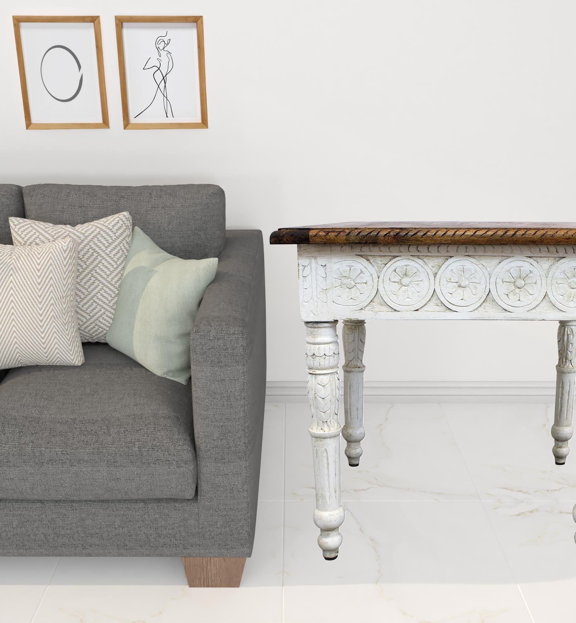 Show off your exquisite taste with this 24" ivory and brown solid wood square end table. Offering a nice color combination, the top of this solid wood table is brown, while the base compliments it nicely in ivory. The purposefully distressed finish gives this table an authentically rustic feel. A great accent on either side of the sofa or bed, this adorable end or side table is just what you need. You can match it with other pieces to get the ideal look for your place. 24" H x 24" W x 24" D