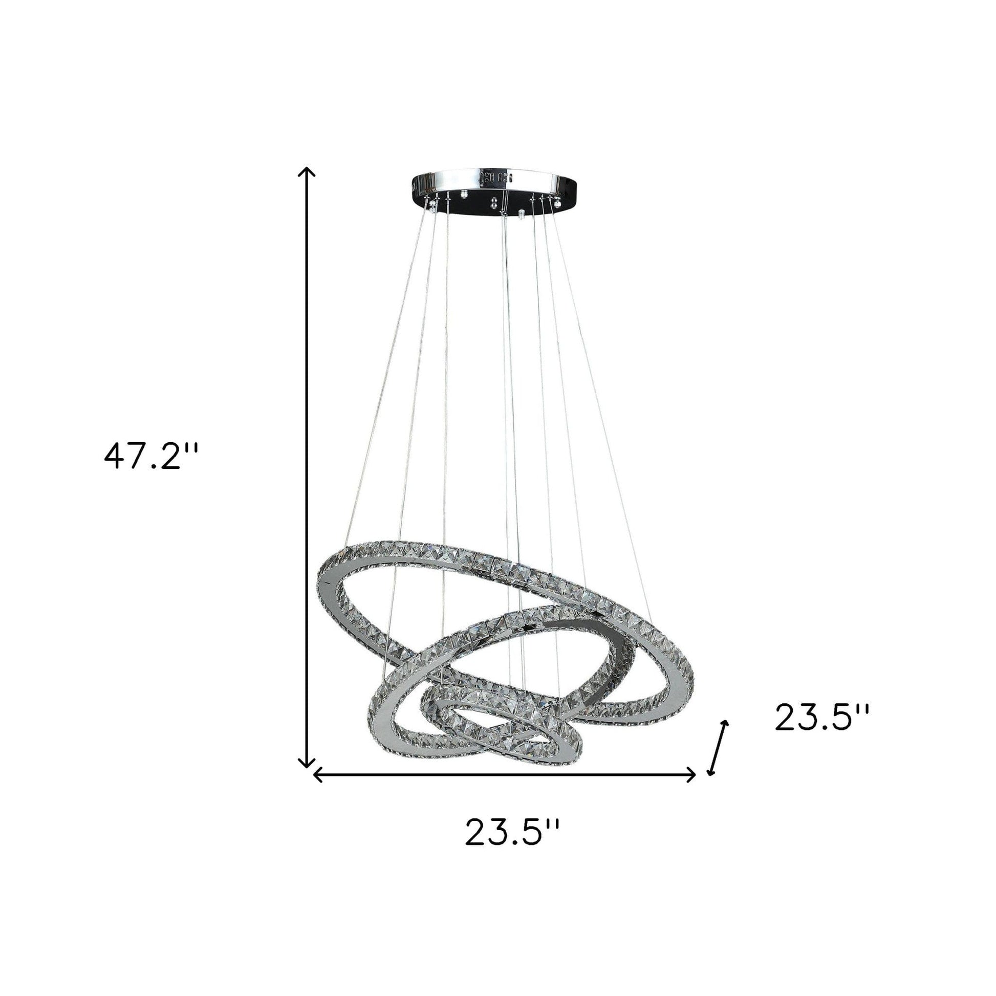 Brighten up your space with this gorgeous silver chrome geometric asymmetrical stacking rings LED chandelier. Contemporary and with a touch of glam, this unique fixture suspends from the ceiling with clear wire cables and features rings full of faux crystal pieces to light up your space. Use this lighting fixture as the focal point of your hallway, dining room, living room, bedroom. 47.2" H x 23.5" W x 23.5" D