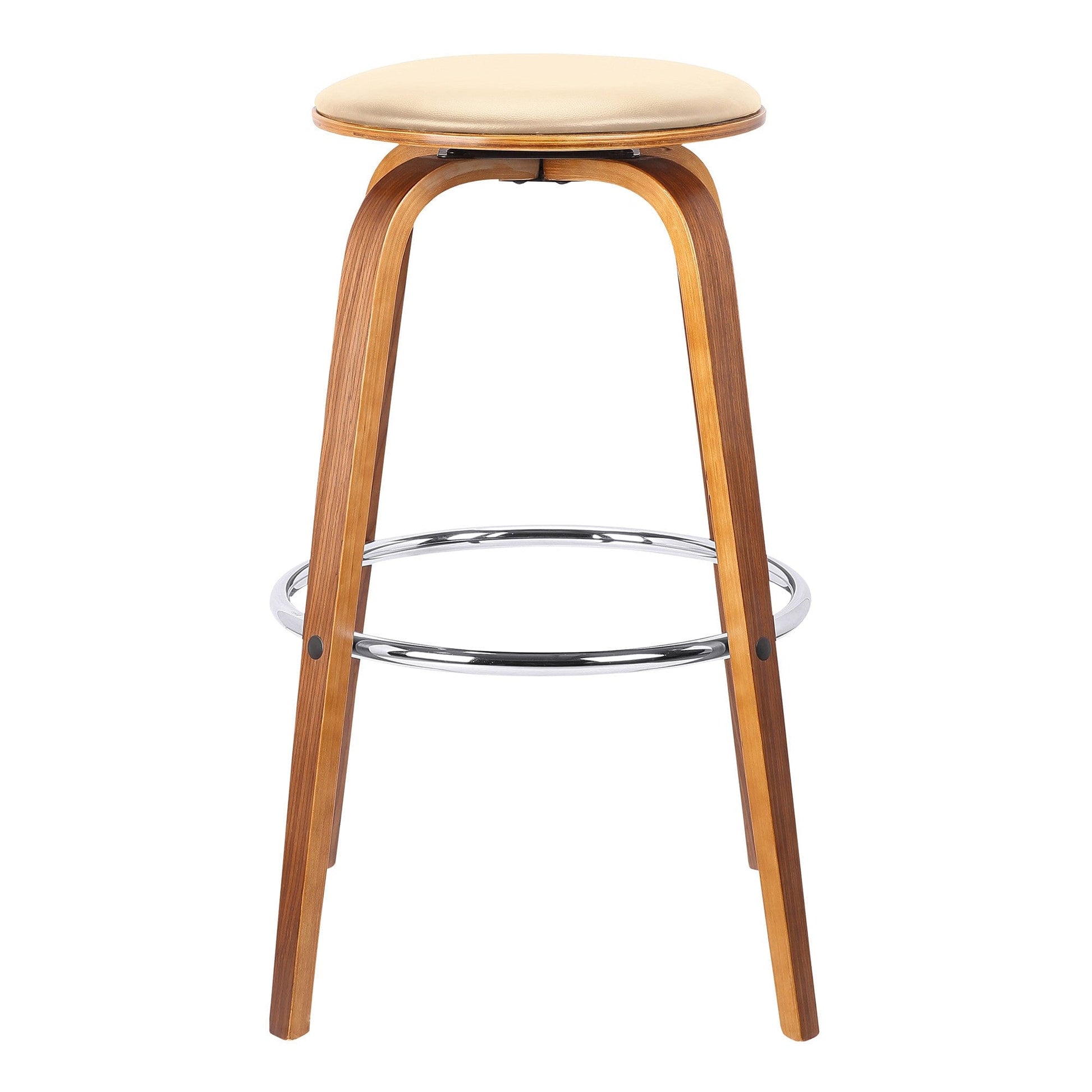 Get that mid-century English pub look in your living room with this Cream Faux Leather Backless Modern Swivel Bar Stool. The dated design along with the antiquated colors bring a flourish of a retro aesthetic tailored to fit your style. The backless stool rotates 360-degrees to make it a fun addition to your living room when entertaining guests. Crafted with a fine faux leather upholstery and metal base, the chair is minimalist without being dull. The base of the chair in a walnut wooden finish is paired with a cream-toned faux leather for a luxurious look with an old world flair. The simplicity of the stool puts a bold influence in any room that is styled in a modern or traditional aesthetic. 25” x 17” x 17”