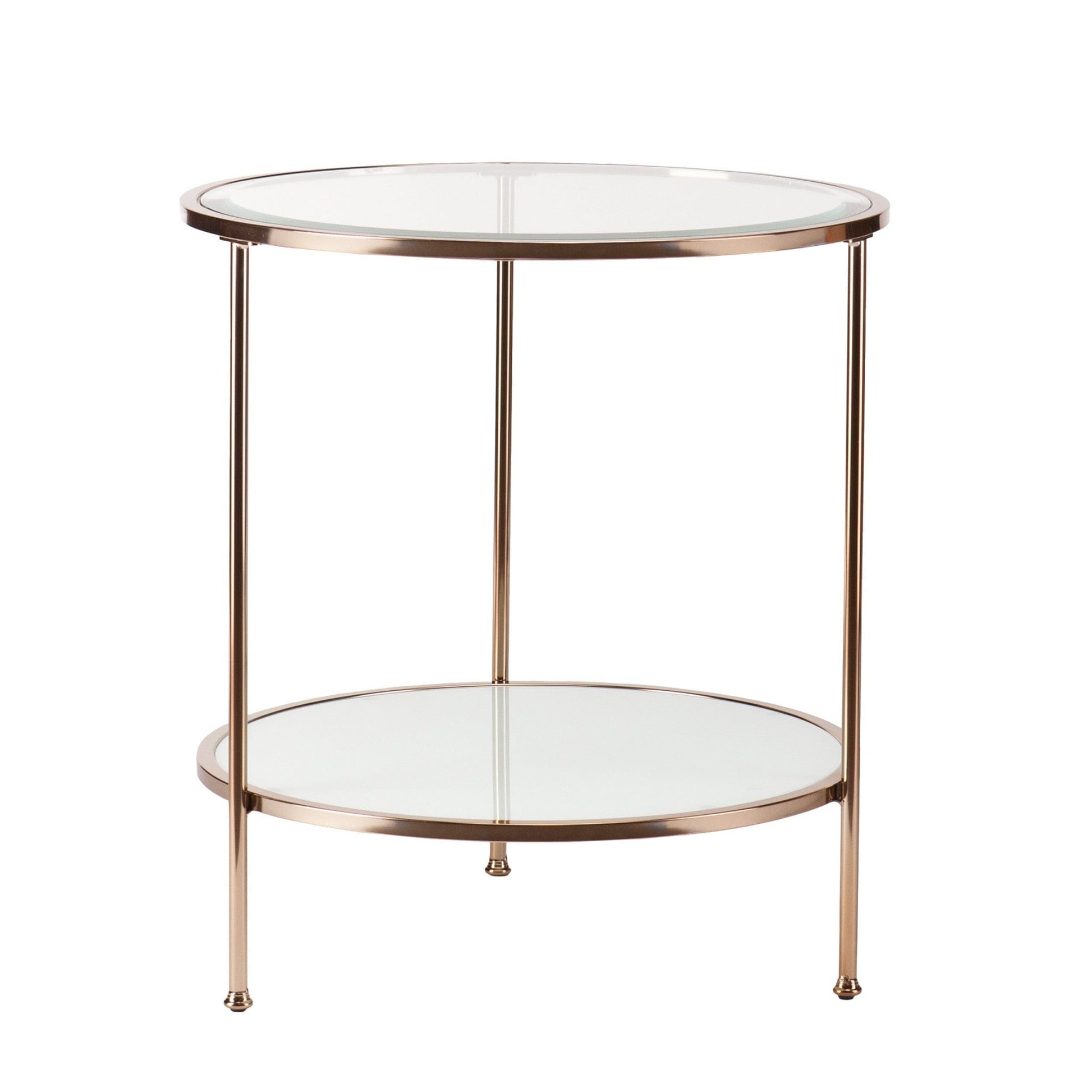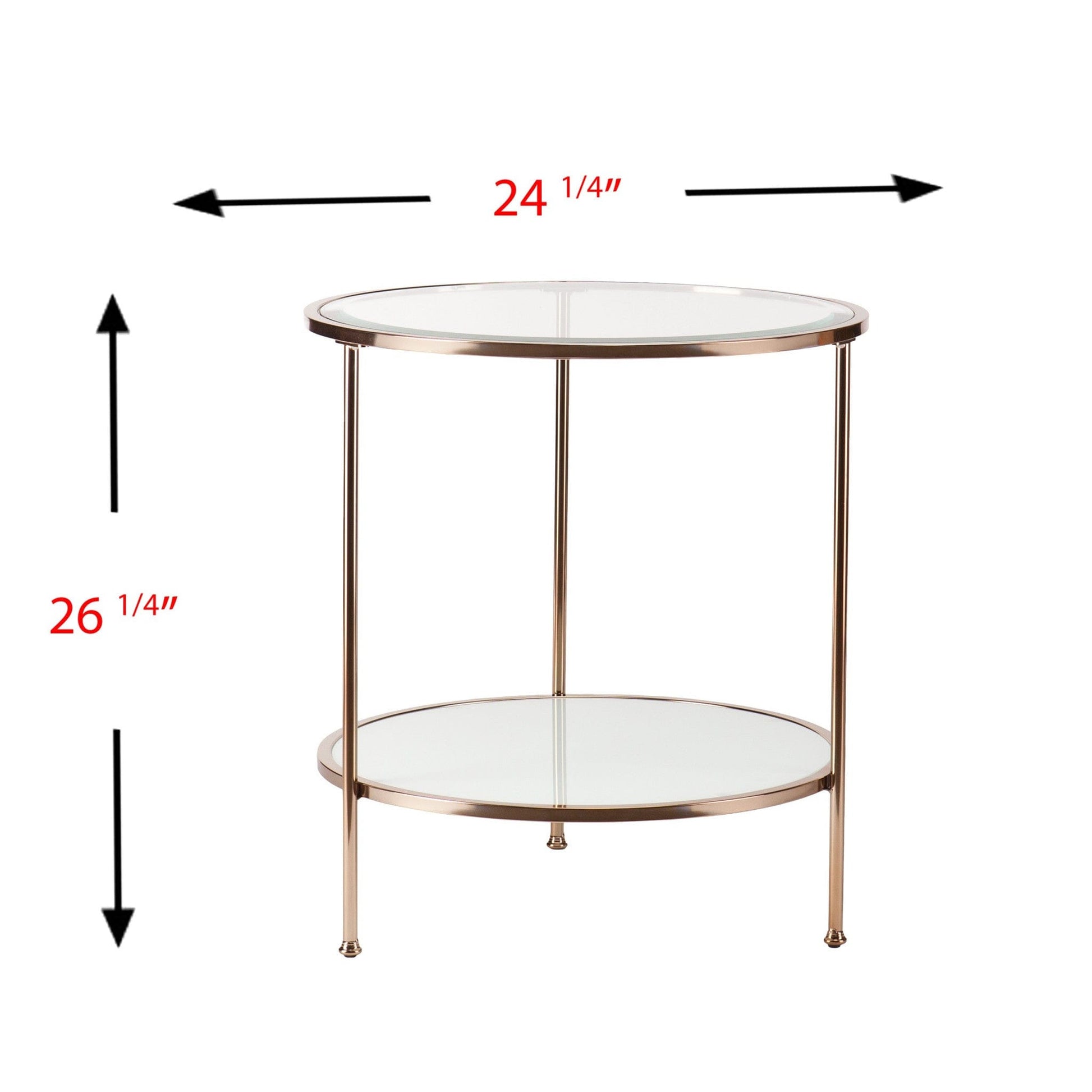 Distinctive in style, the 26" gold glass and iron round end table with shelf radiates a versatile charm. This end or side table is expertly made from high quality metal. A solid gold iron frame is finished off with a matching gold glass table, giving this table a chic monotone look. Help to keep your space organized with the included single shelf. An ideal location for placing your snacks and drinks, and a place to keep your lamp, frames, or other accessories. You can also use it as an entryway table to hold your keys. 26.25" H x 24.25" W x 24.25" D