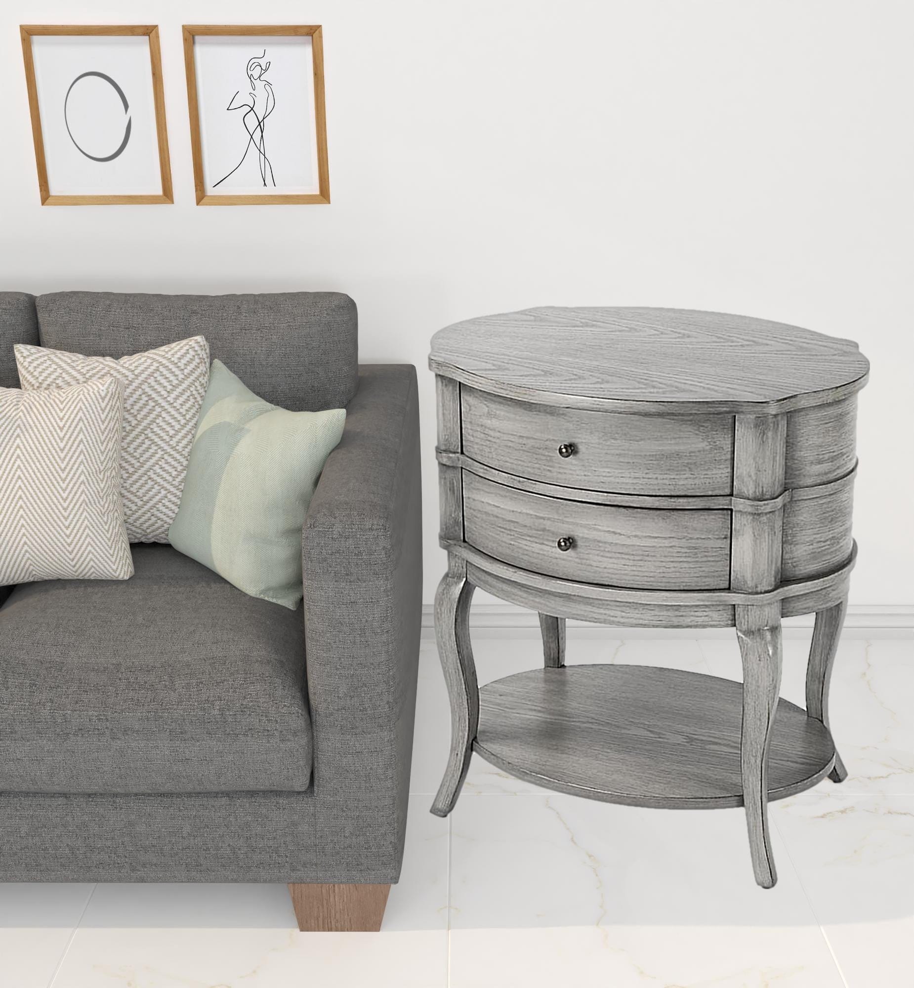 Optimize your space and add some charm to your room with the 26" gray manufactured wood oval end table with two drawers and shelf. This table is made from manufactured wood in a gray color throughout the base and top. Complete with a purposefully distressed finish, this table has an aged, vintage, and rustic feel. Includes a single shelf for handy storage or display space. Includes two easy open drawers for storage of the small essentials. A great accent on either side of the sofa or bed, this adorable end or side table is just what you need. This versatile table is a great accent for most any room. 26" H x 24" W x 18" D