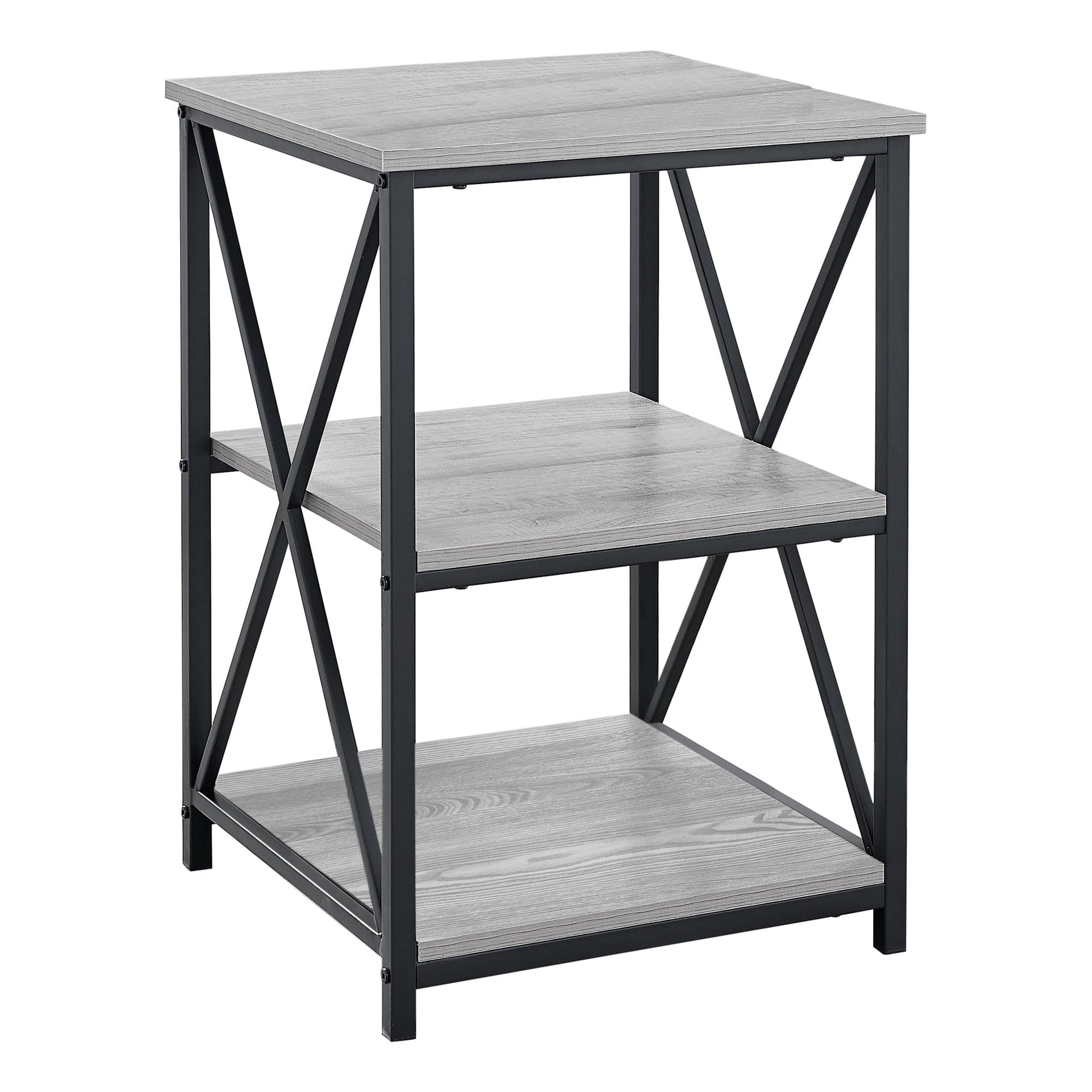This simple, contemporary style end table with an industrial look is a multi-functional accent piece suitable for any room. The stylish black metal legs with an X design on the two sides, contrasts with the warmth of the grey wood look laminate square tops. The two open bottom shelves offer a convenient storage space for books, magazines, or decorative objects with room on top for a small lamp or a place to set down your drink. Bring it into the bedroom as a sleek and compact nightstand for a clean modern touch. Assembly is required.