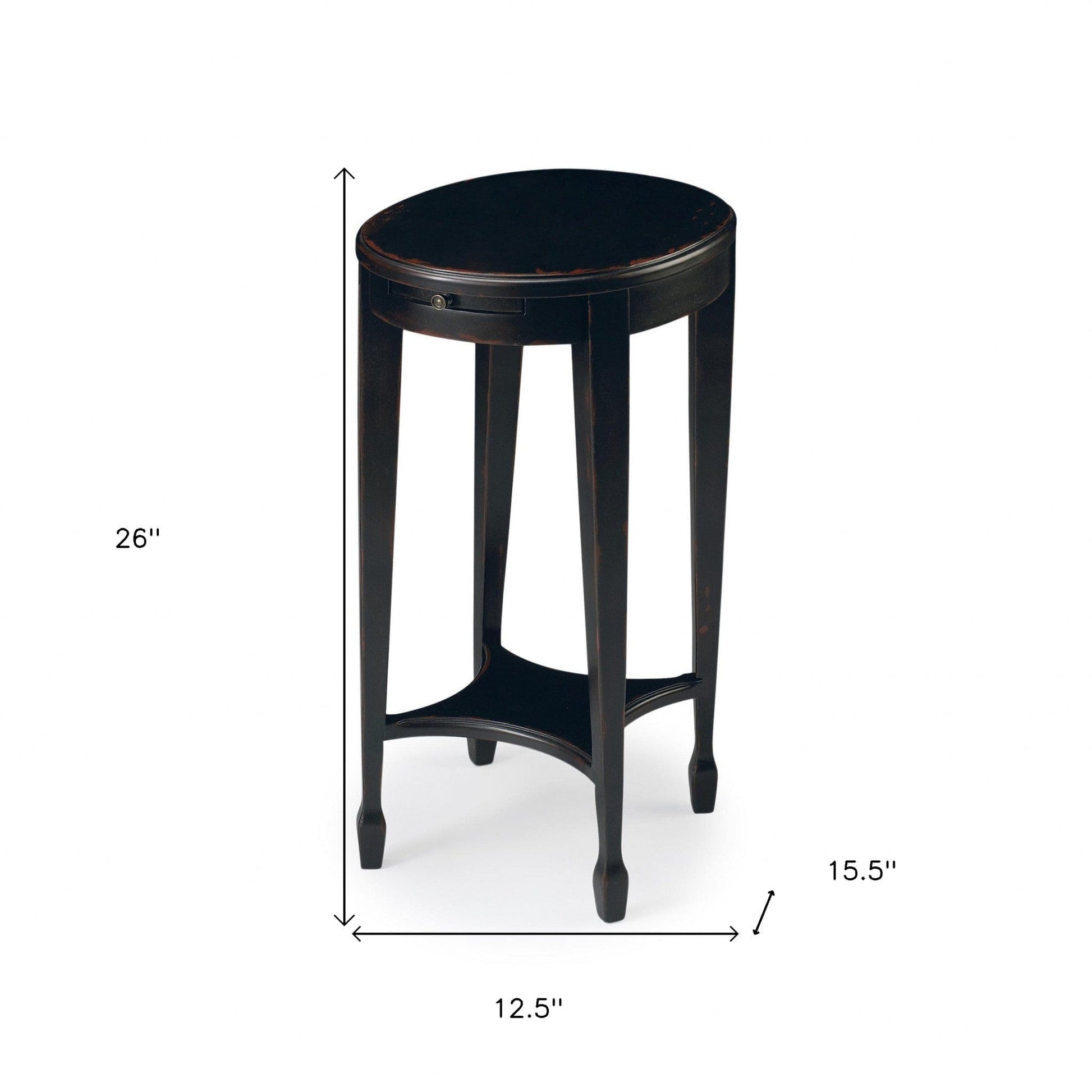 Distinctive in style the 26" rustic black manufactured wood oval end table with shelf radiates a versatile charm. The base of this table is made from solid and manufactured wood in a black color that has a rustic rubbed finish with a red tone underneath. The purposefully distressed finish gives this table an authentically rustic feel. Help to keep your space organized with the included single shelf. An ideal location for placing your snacks and drinks, and a place to keep your lamp, frames, or other accessories. You can also use it as an entryway table to hold your keys. 26" H x 12.5" W x 15.5" D