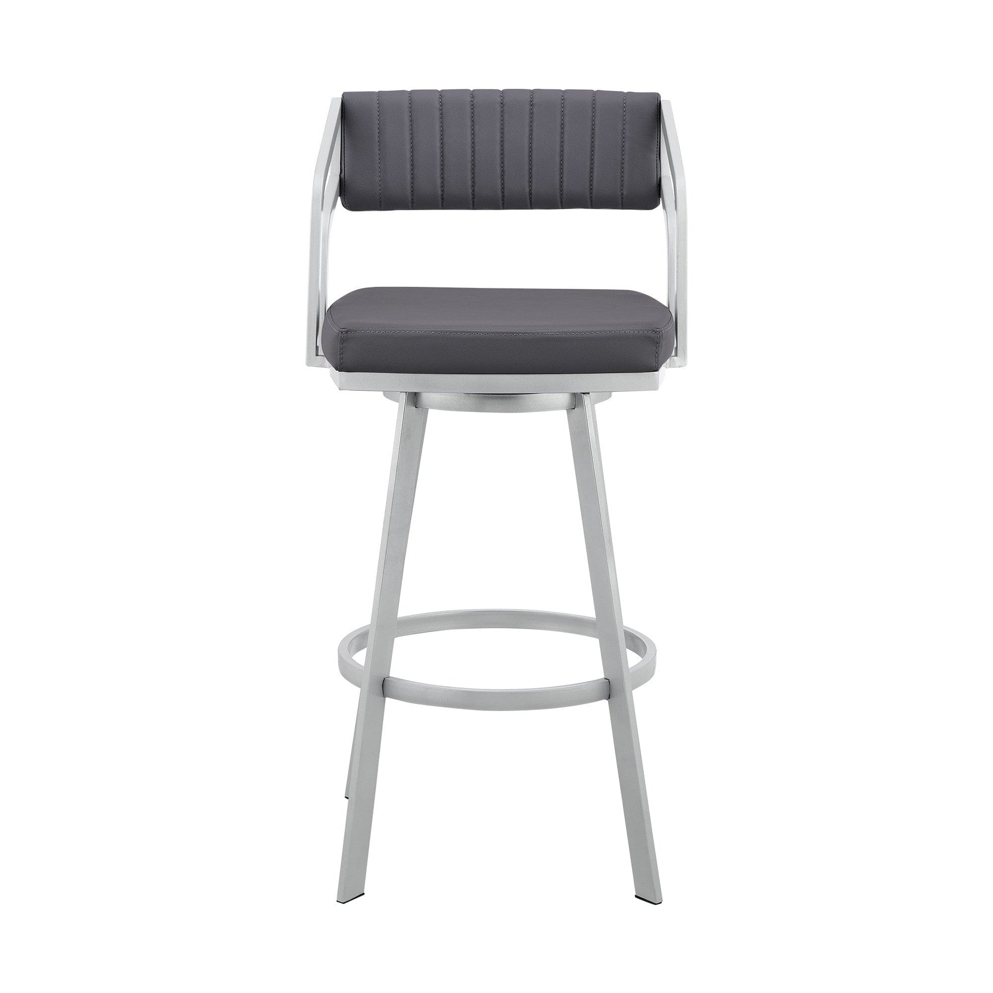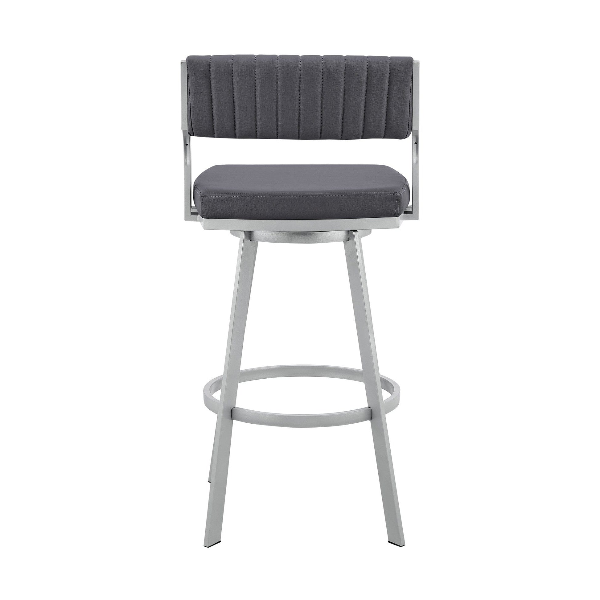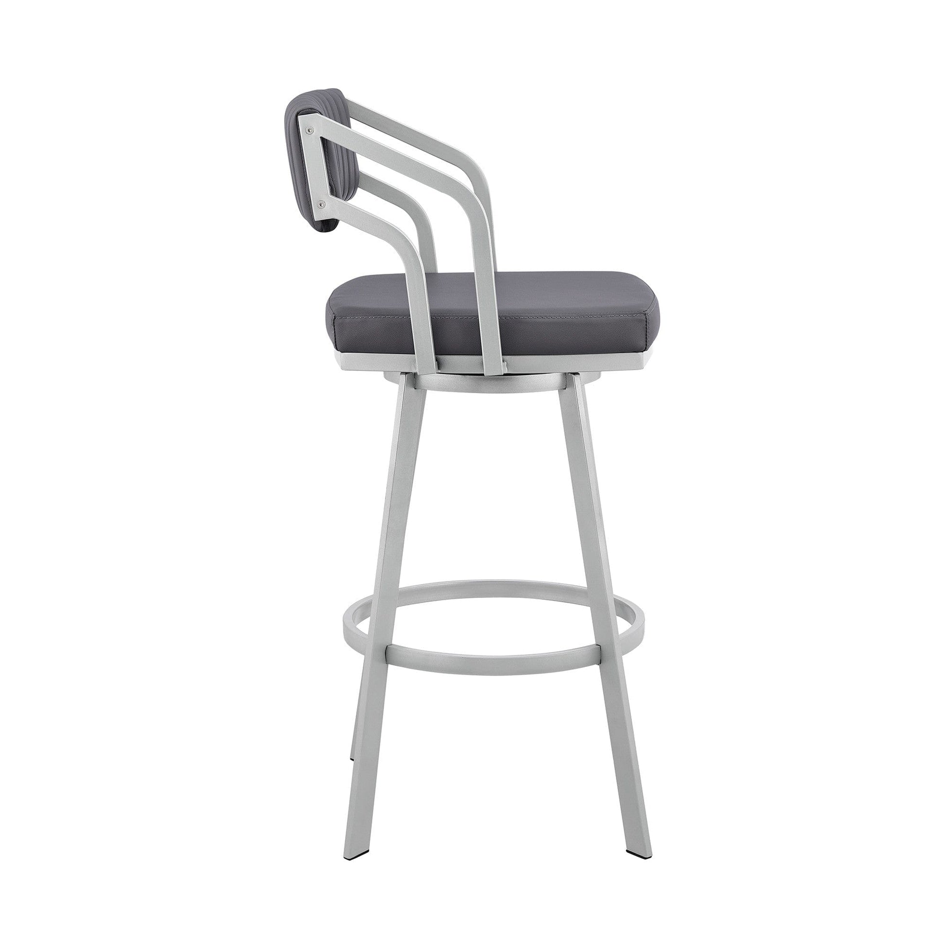 Enjoy all there is to be enjoyed as far as style is concerned with this 26" Timeless Slate Grey Faux Leather Silver Finish Swivel Bar Stool. The metal frame does more than just providing support. It provides a beautiful contrast to the luxurious faux leather upholstery the stool adorns. Its low arm design is something to adore as it allows you to enjoy enough stability when seating. The full 360-degree swivel effect can make you turn in different directions effortlessly whenever you want. The stool also features a channel style stitching on the back while the plush seat with an open lower back provides comfortable and breathable seating. 36 x 21 x 22