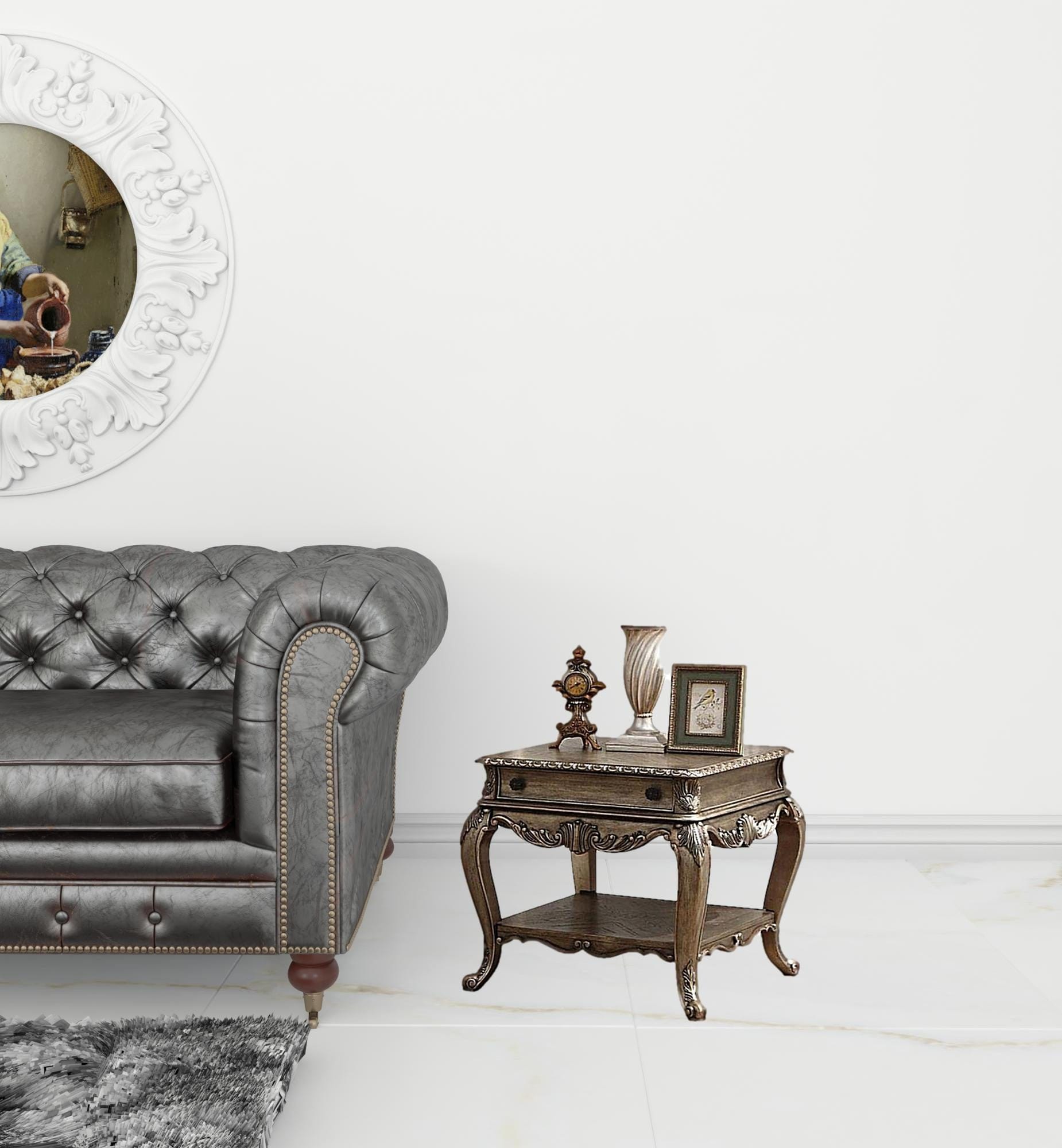 Optimize your space and add some charm to your room with the 26" vintage oak manufactured wood and polyresin rectangular end table with drawer and shelf. A sleek vintage oak monotone color gives this polyresin and manufactured wood table a fresh and updated look. Includes a single shelf for handy storage or display space. Includes a single easy pull out drawer for handy storage of life's little essentials. Side tables are a great way to flank your sofa, use as an accent next to your favorite chair, or can even be used bedside. You can also use it as an entryway table to hold your keys. 26" H x 26" W x 28" D