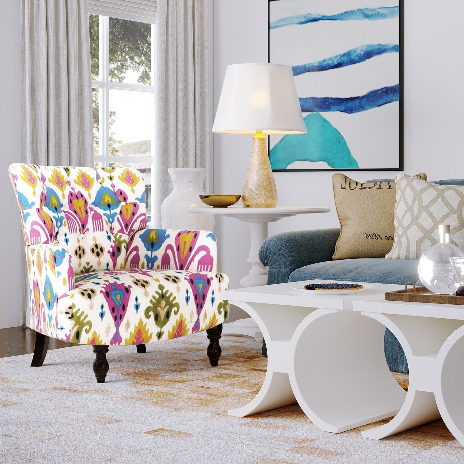 Stylish, elegant and fully functional, the 28" pink lemongrass and brown polyester blend abstract floral arm chair adds a touch of panache to any set up. This updated and modern pink lemongrass abstract design arm chair is masterfully upholstered in durable polyester blend. The high quality manufactured wood inner frame flaunts convenient armrests and a tufted back that are complimented by soft and comfortable cushioning. 38.5" H x 27.5" W x 34.25" D