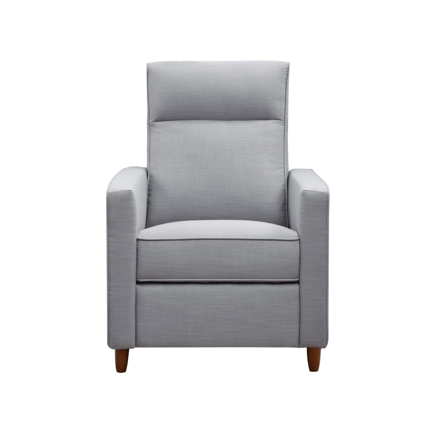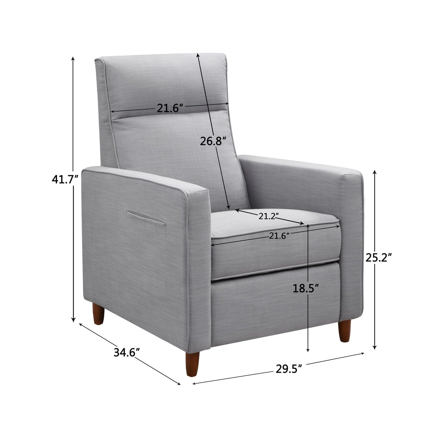 Improve the look and feel of your space and give yourself a place in which to relax with this fantastic recliner. Its sturdiness and clear fineness are obvious as well. This recliner is a high quality piece, which is made from comfortable and long lasting fabric. You'll turn heads with this one. This simple manual recliner has a push back mechanism and no visible handle. It blends aesthetic appearance with practicality perfectly. To complete this delightful look, it shows off a striking elegance perfect for the modern home. As for measurements, they're 41.7' for height, 29.52' for width, and 34.64' for depth, and it weighs 77 pounds. When you need to unwind and let your hair down after a long day, this recliner is the best piece you'll find. You can match it with other pieces to get the best look possible.
