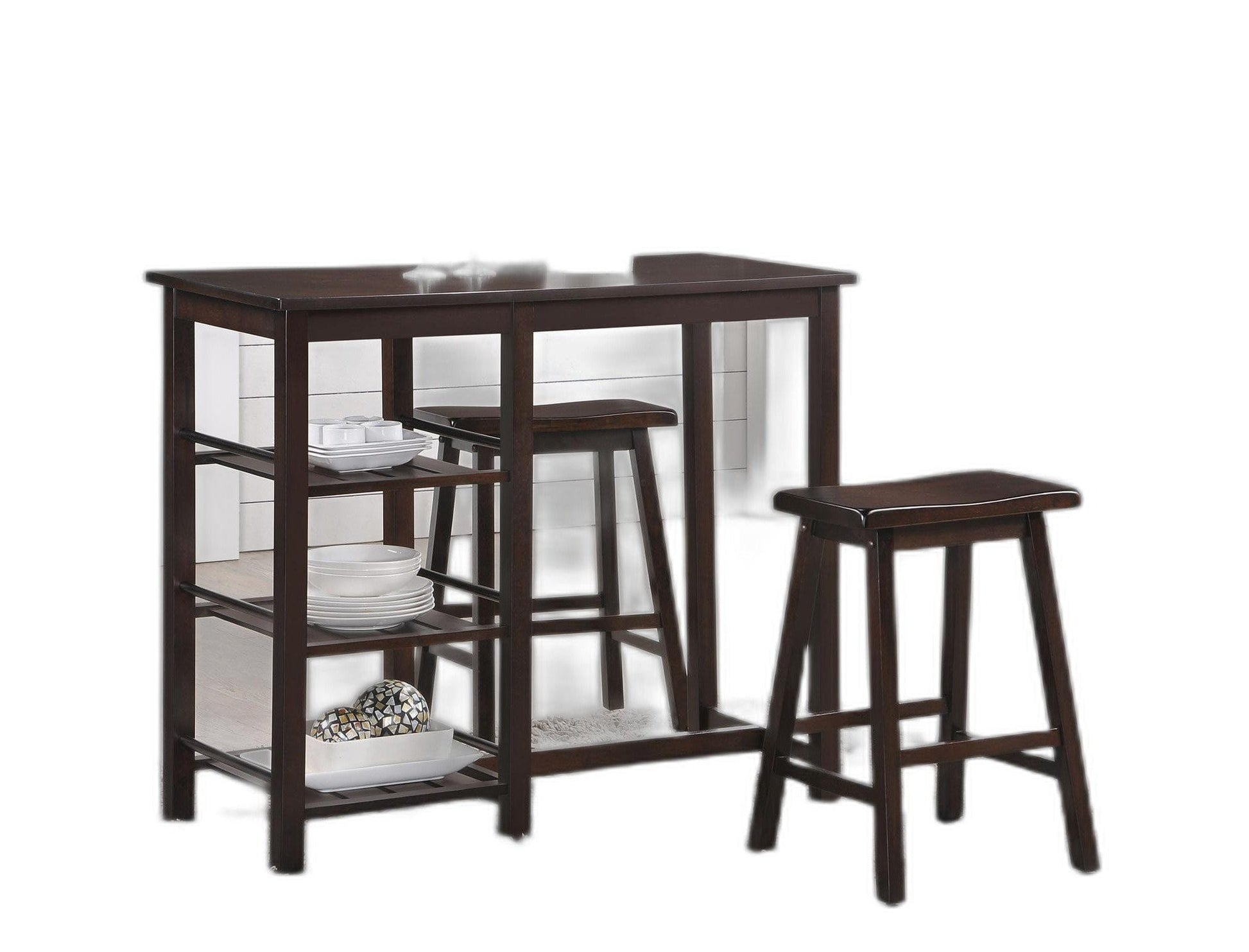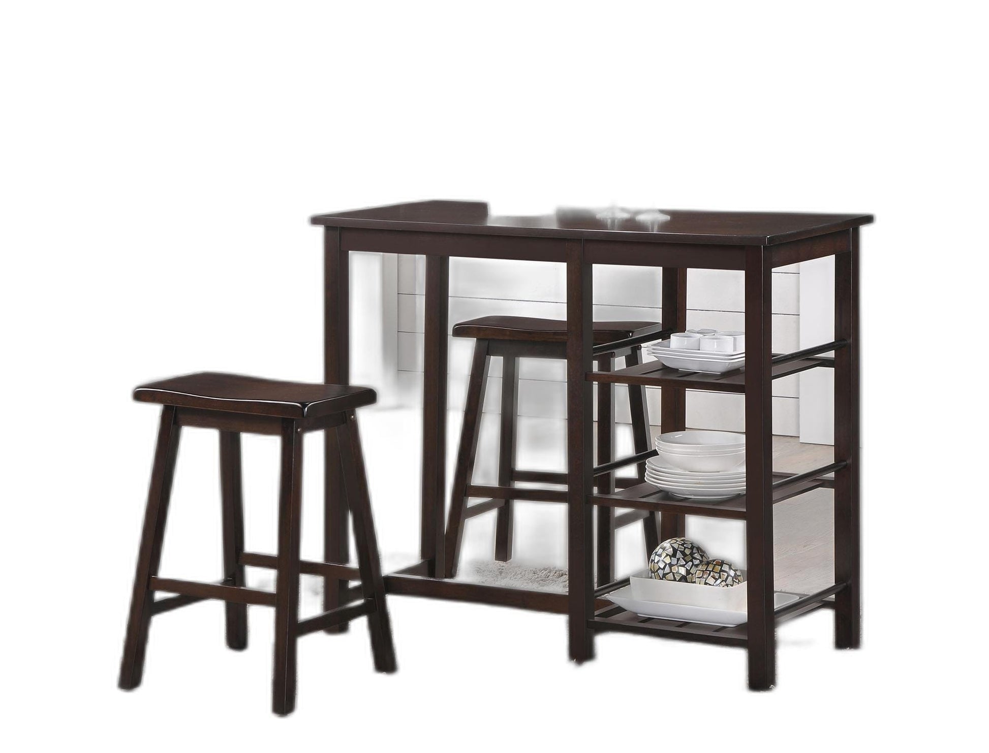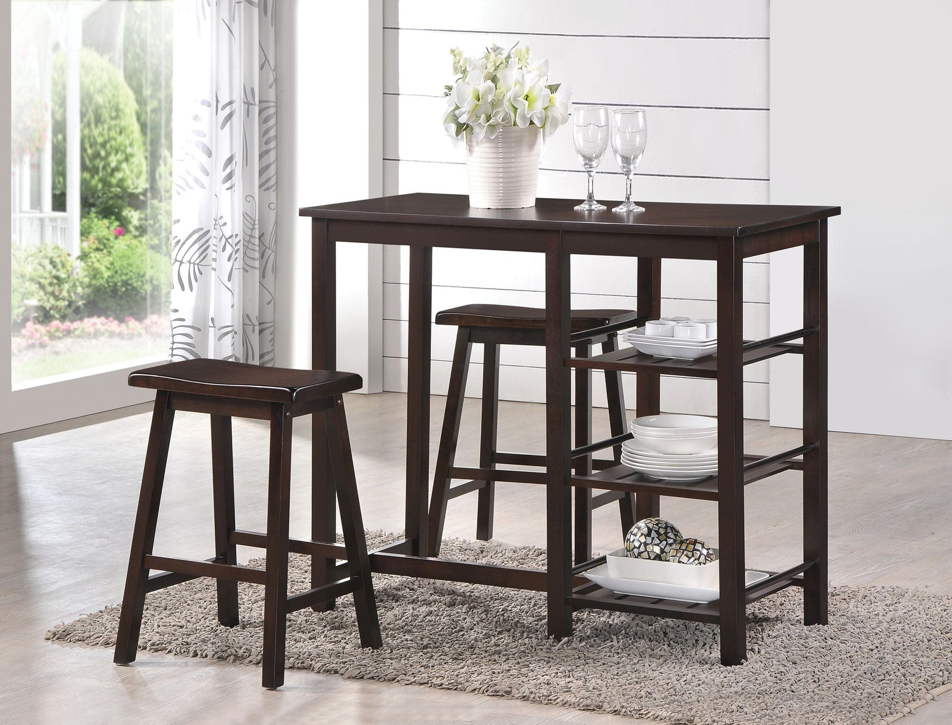 The 3 piece pack breakfast set offers simple lines with a versatility perfect for any small dining space. This breakfast table features a smooth rectangular top, tapered legs, and ample storage shelves perfect for apartments or small kitchen areas. The two matching armless stools include wooden saddle seat, and square legs. All carefully crafted with selected woods and veneers in walnut finish. Table Measures: 19"w x 43"l x 36"h, Stool: 24"h