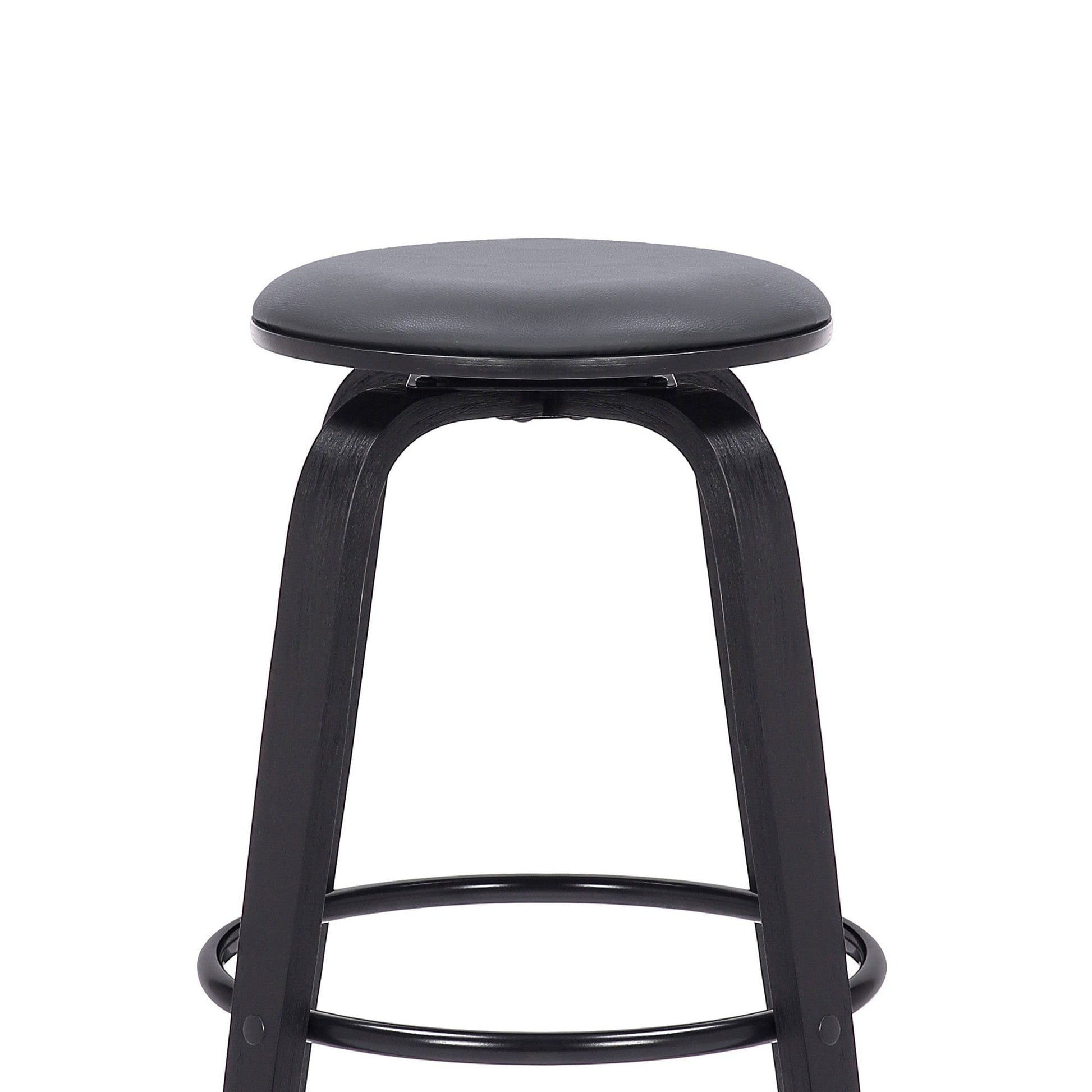 Get that mid-century English pub look in your living room with this Gray Faux Leather Backless Modern Swivel Bar Stool. The dated design along with the antiquated colors bring a flourish of a retro aesthetic tailored to fit your style. The backless stool rotates 360-degrees to make it a fun addition to your living room when entertaining guests. Crafted with a fine faux leather upholstery and metal base, the chair is minimalist without being dull. The base of the chair in a black wooden finish is paired with a gray faux leather for a luxurious look with a modern flair. The simplicity of the stool puts a bold influence in any room that is styled in a modern or traditional aesthetic. 29” x 17” x 17”