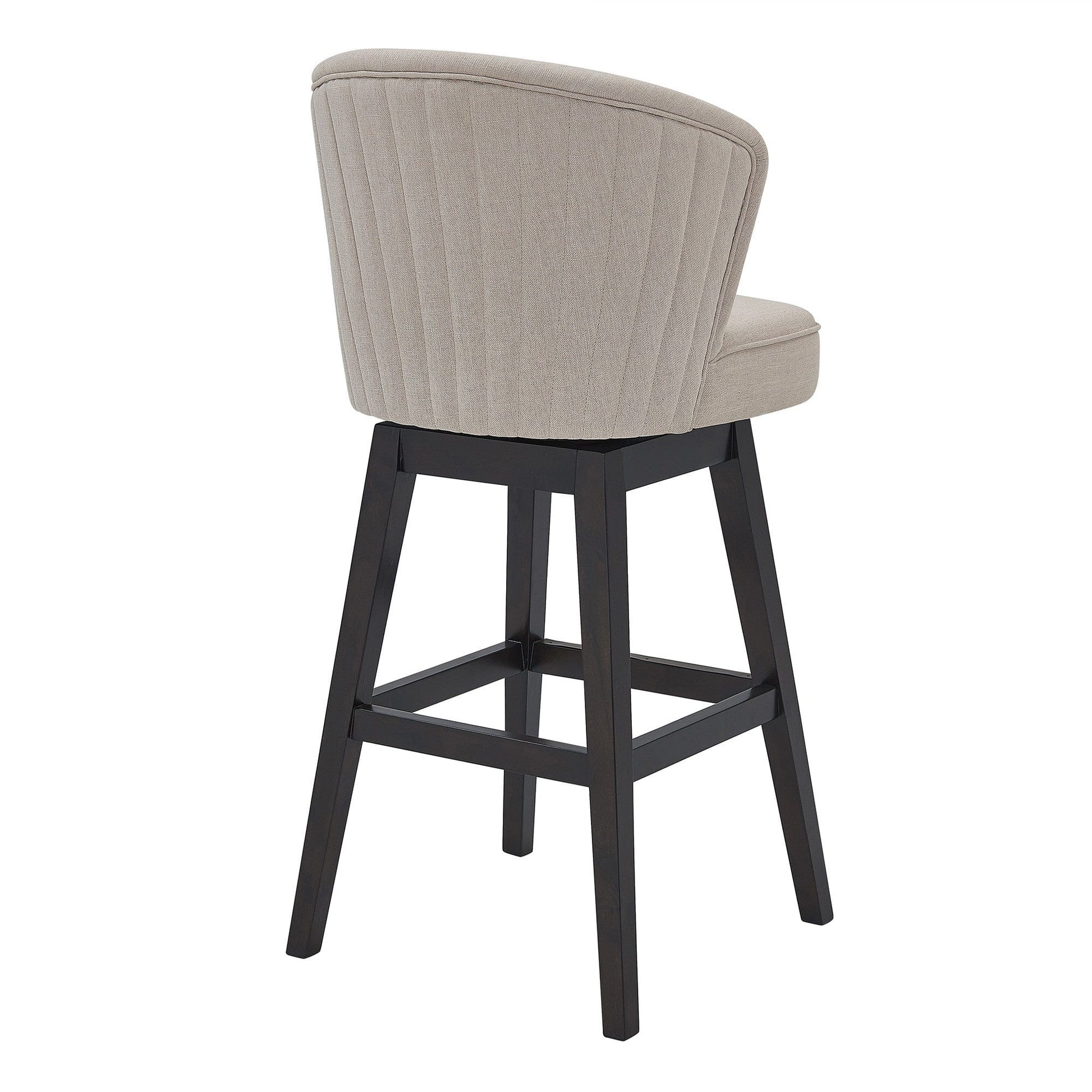 Every design marks an important moment in history and this 30" Tan Espresso Wood Fabric Swivel Bar Stool is your chance to be part of one. With comfort already guaranteed, it's important to prioritize style next, which you'll greatly enjoy because that's what this bar stool will bring to your home. Its retro modern style is well accented by the vertical channel stitching across the backside of the backrest. The high-density foam cushion is beautifully wrapped in a plush fabric upholstery that is durable enough to last for many years. You can also enjoy the full mobility provided by the stool's 360-degree swivel function while you place your feet on the convenient footrest featured on the wooden base. 43.5" x 22.5" x 23"