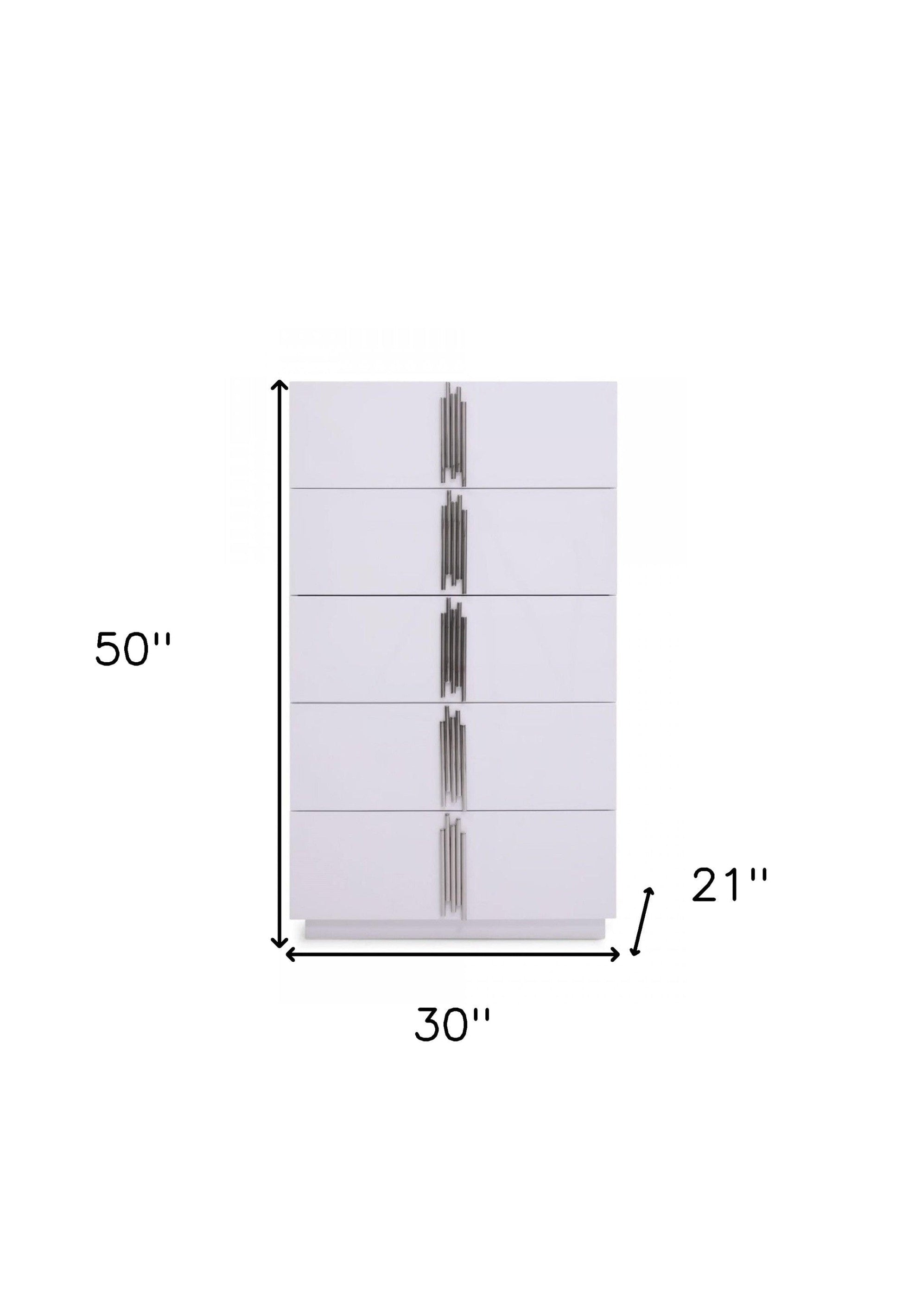 Enhance your room into a visually delightful and highly functional space with this 30" white silver manufactured wood + solid wood stainless steel five drawer standard chest. The space saving design of this standard chest makes it a great choice for space challenged spaces or small walls within your room. Equipped with five easy open drawers for practical and good looking clothing storage. Its a high quality piece, made from high grade manufactured wood + solid wood, stainless steel. 50" H x 30" W x 21" D