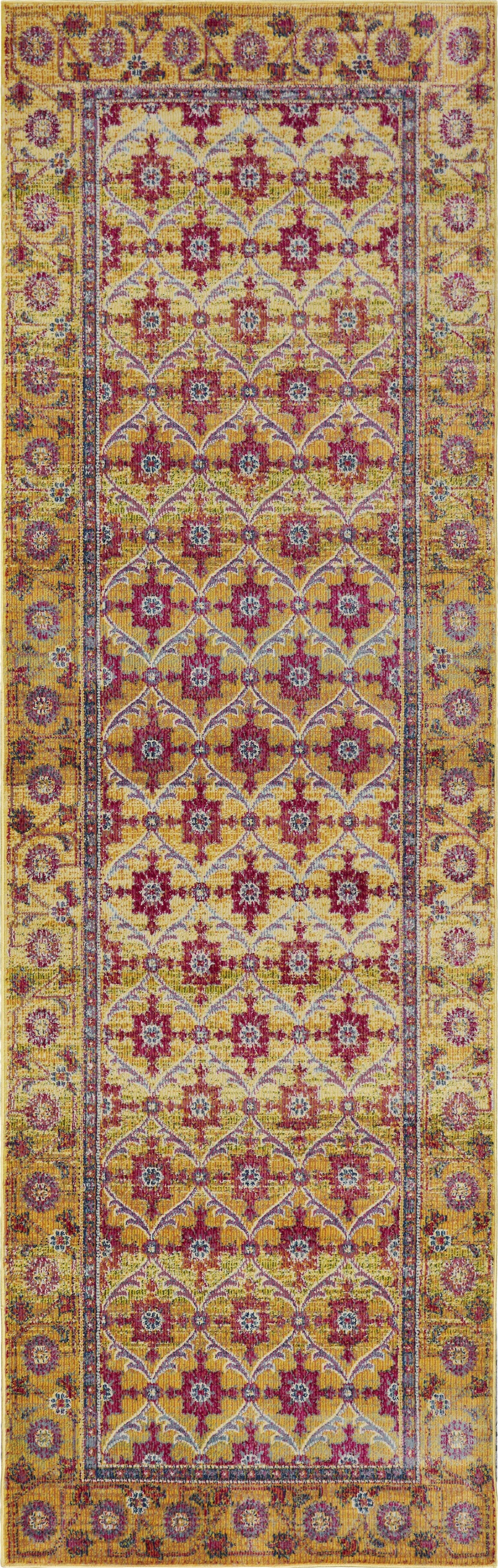 Dreamweaver is made-up of transitional and traditional vintage inspired rugs and will work f or anyone who is willing to add a show-stopping piece to their home. They are machine woven in Turkey of Polypropylene with a pile height. Dreamweaver 5855 Golden Sunrise 31" x 96" Runner. Machine-Woven of 100% Polypropylene with No Backing. Made in Turkey. Vacuum regularly & spot clean stains. Professional cleaning recommended periodically.