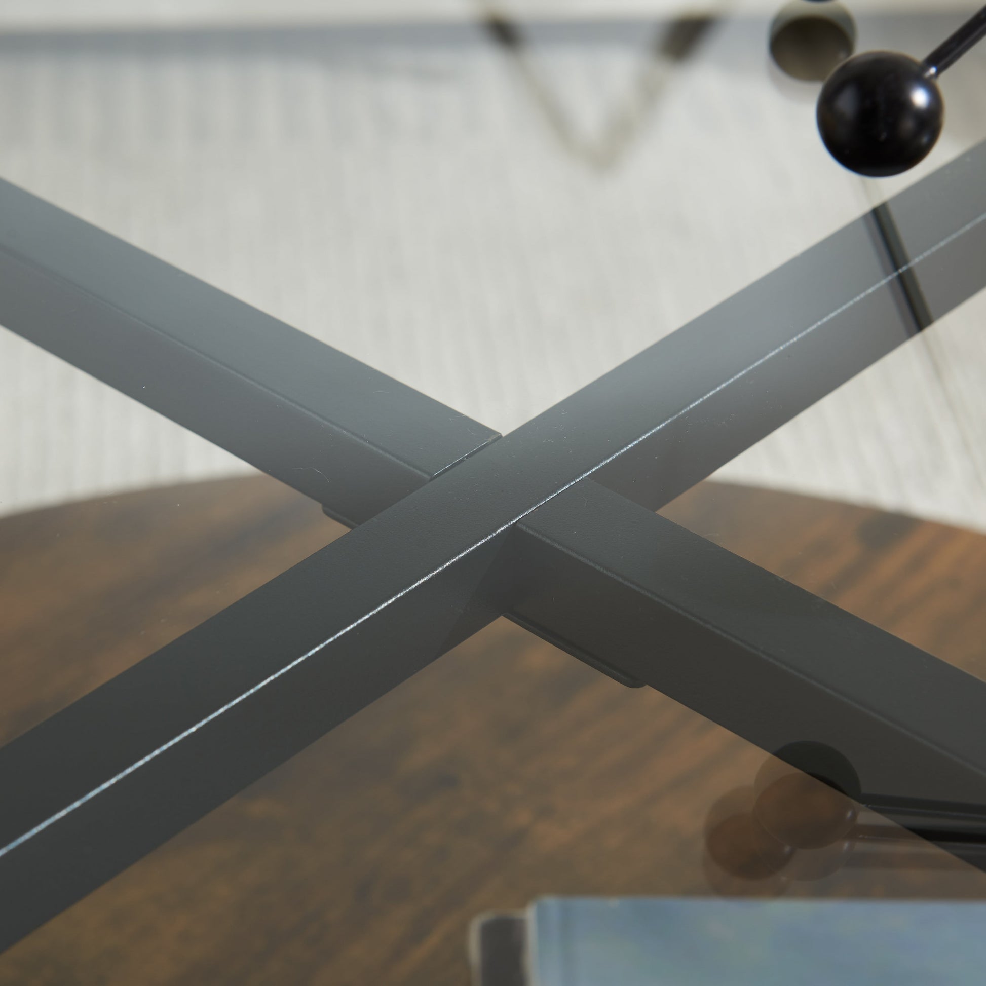Make a statement with the 32" black brown and glass glass round coffee table with shelf and infuse a dash of character and personality into your space. This multi-functional coffee table is built to last. The frame of this table is made from steel in a black color that creates a good looking visual contrast to the clear glass tabletop and the deep caramel brown rustic wood grain bottom shelf. This round table features a unique shape to give your room a visually pleasing accent. The double layer of table surface offers you options for storage, display, and entertaining. If you're looking for something that can fit both into a living area, bedroom, or office, this coffee table is for you. This coffee table is the sturdy, reliable and stylish answer to your living room needs. 17.72" H x 31.5" W x 31.5" D