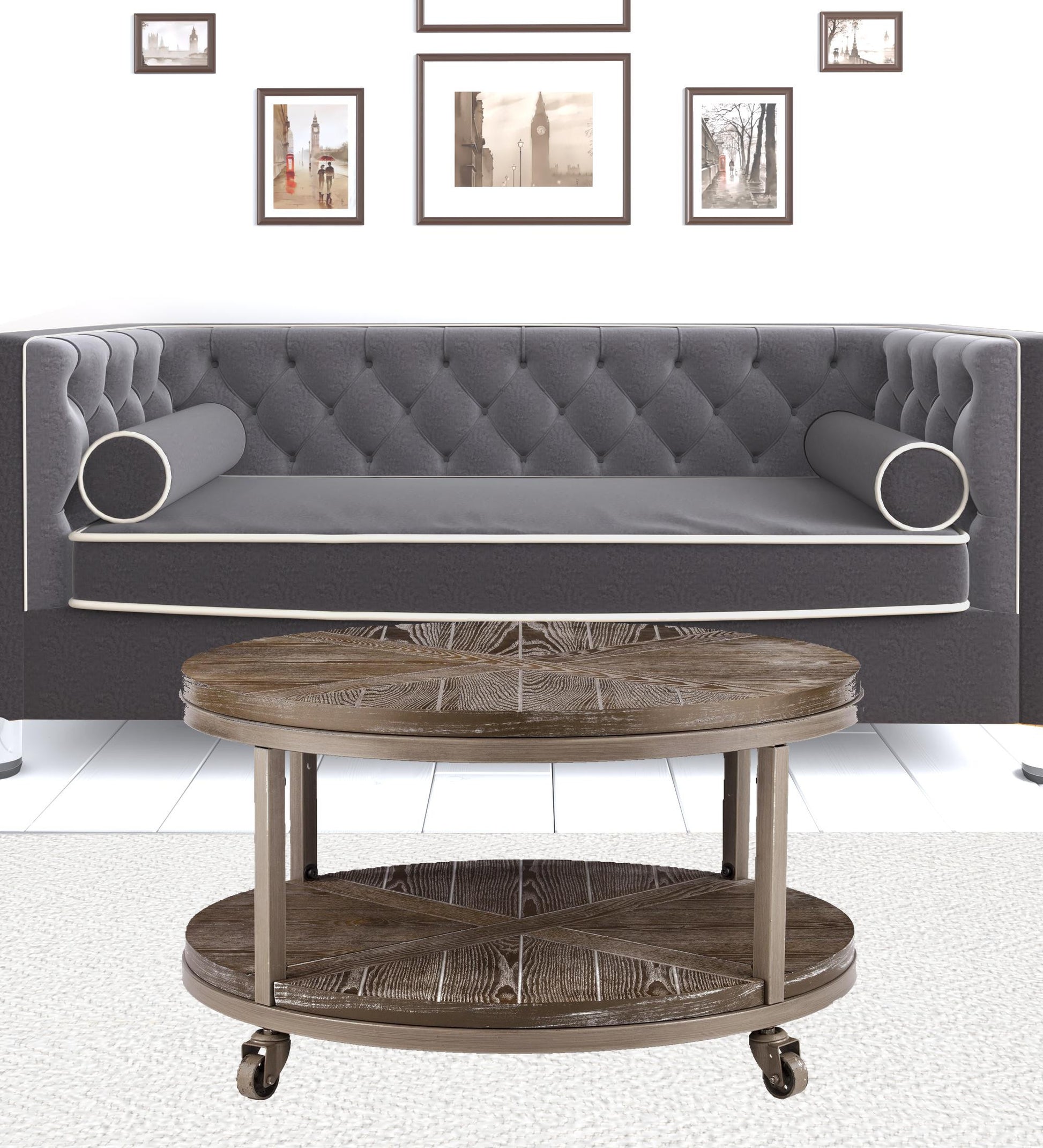 This good looking 32" Brown Rustic and Distressed Round Two Tier Rolling Coffee Table. The brown coloration runs throughout this good looking metal and solid manufactured wood table. This round table features a unique shape to give your room a visually pleasing accent. The brown coloration throughout gives this piece an updated and refreshing look. Wheels give the table added versatility and mobility if needed. If you're looking for something that can fit both into a living area, bedroom, or office, this coffee table is for you. This coffee table is the sturdy, reliable and stylish answer to your living room needs. 17.5" H x 32" W x 32" D