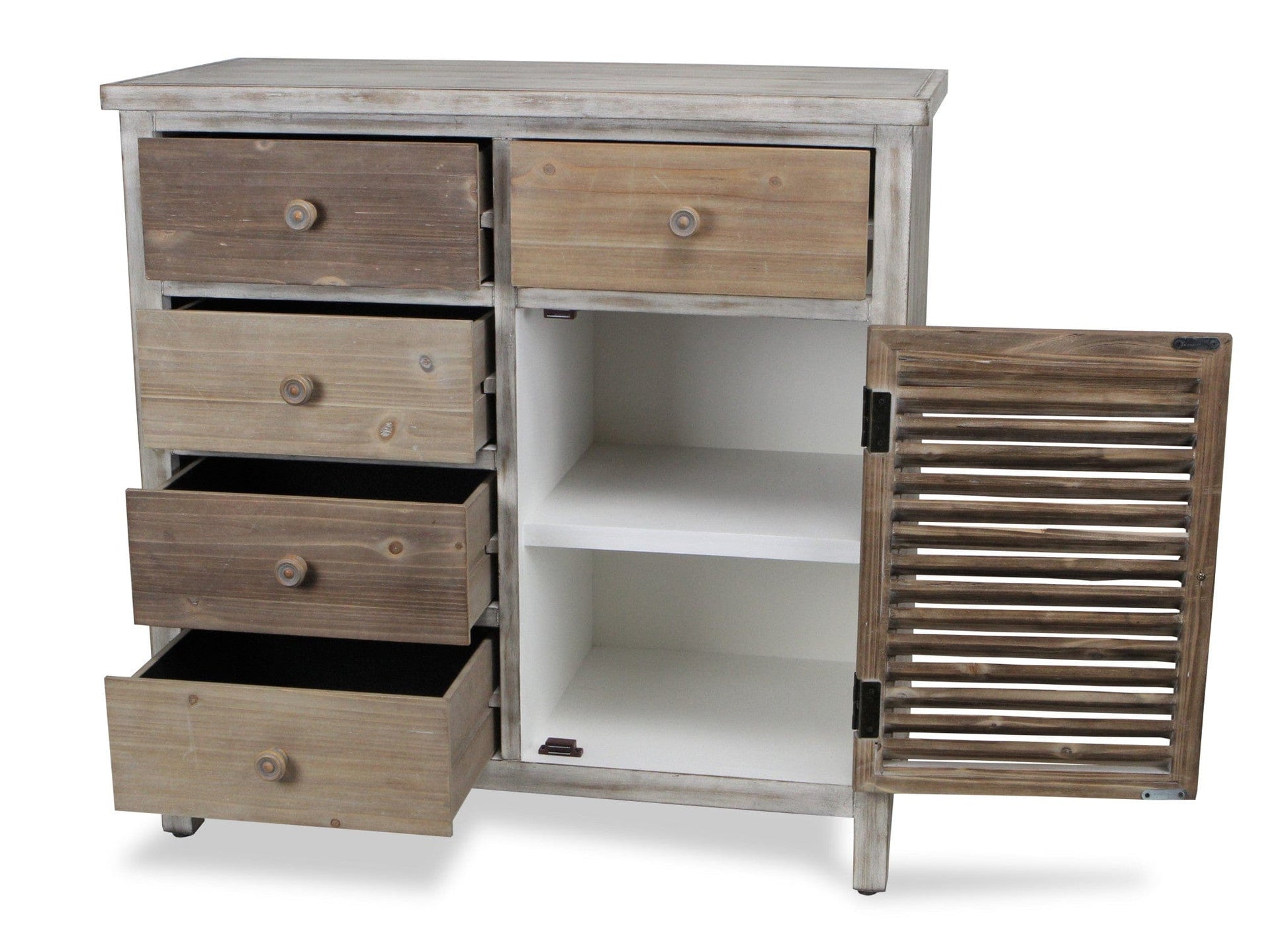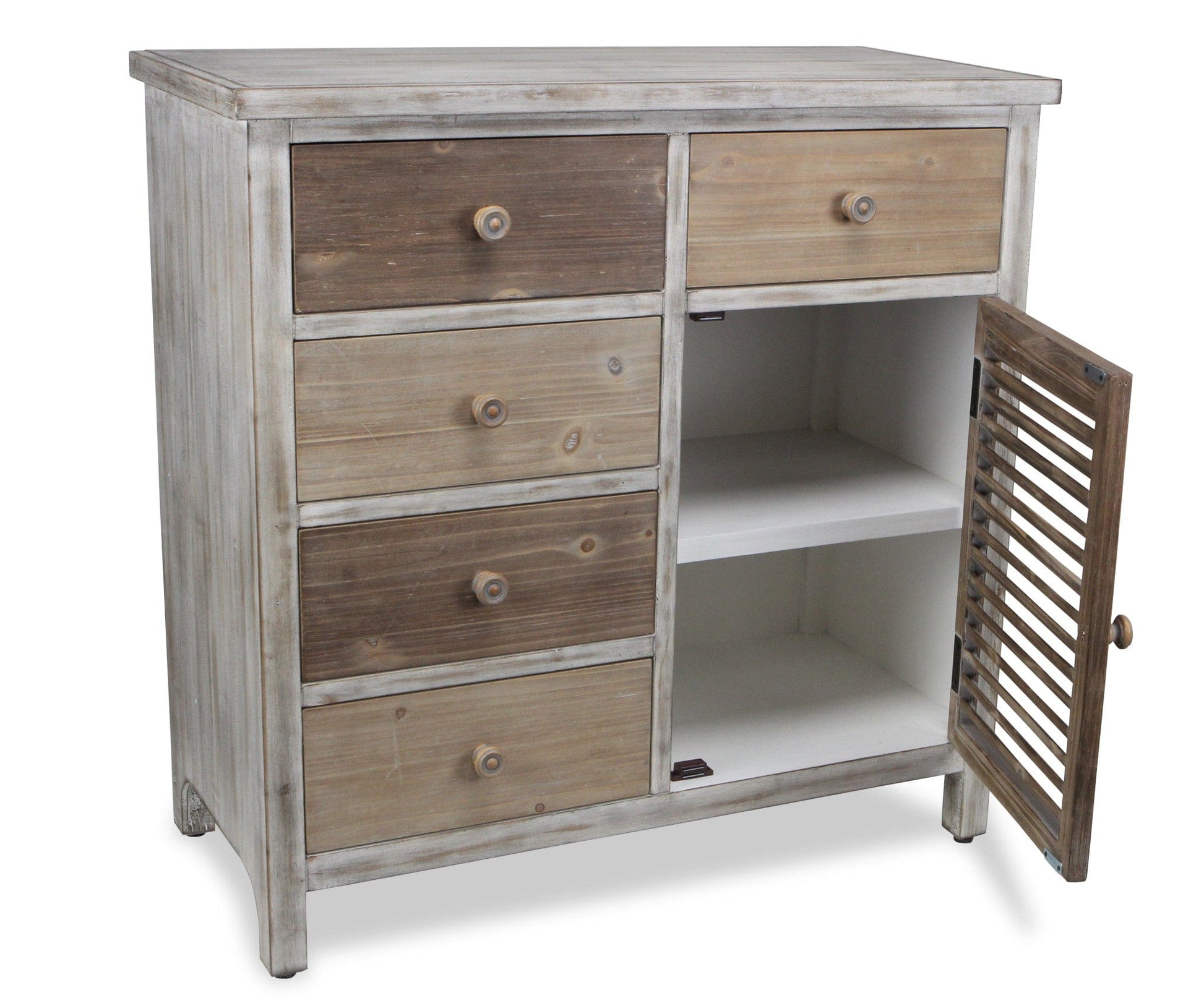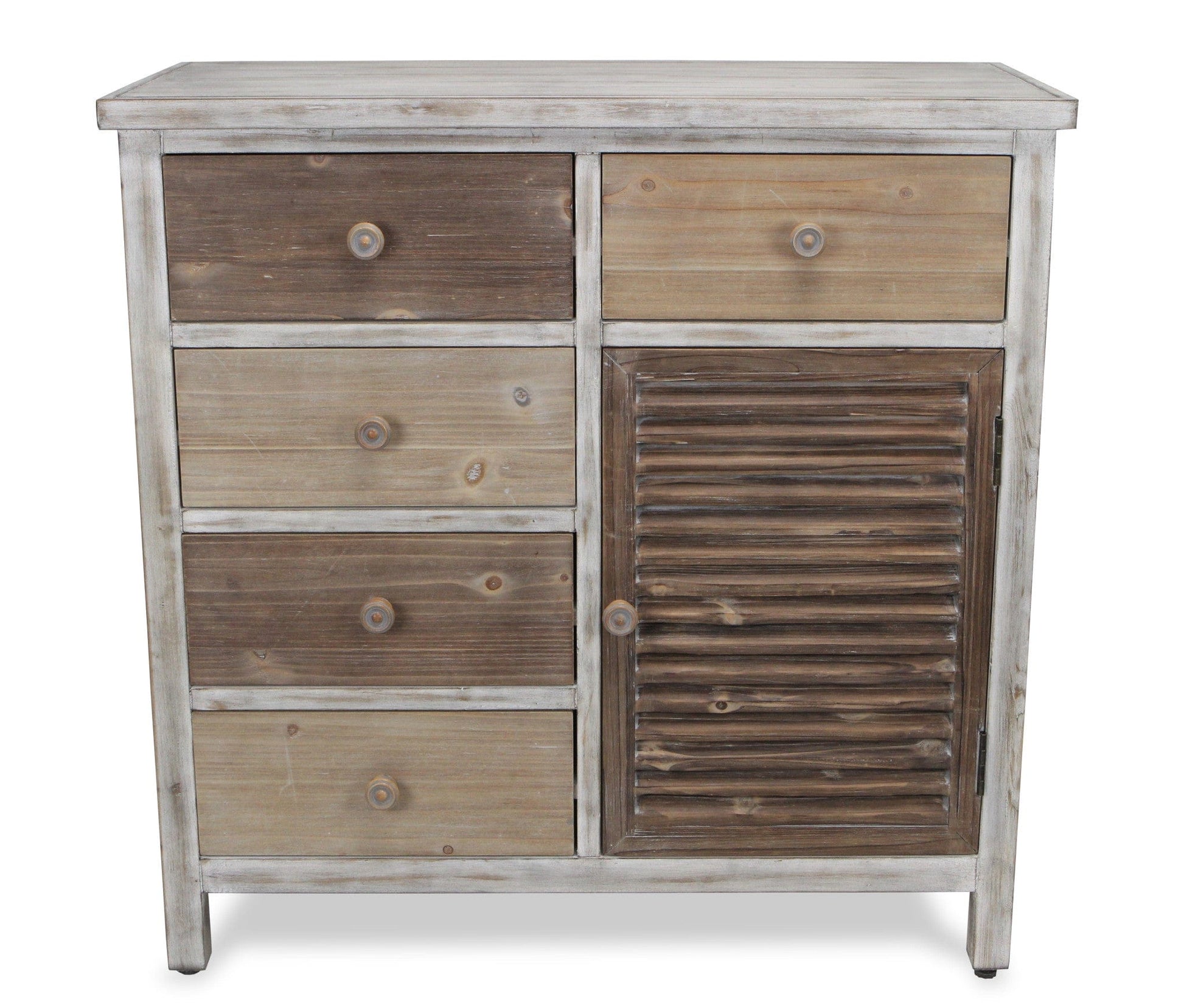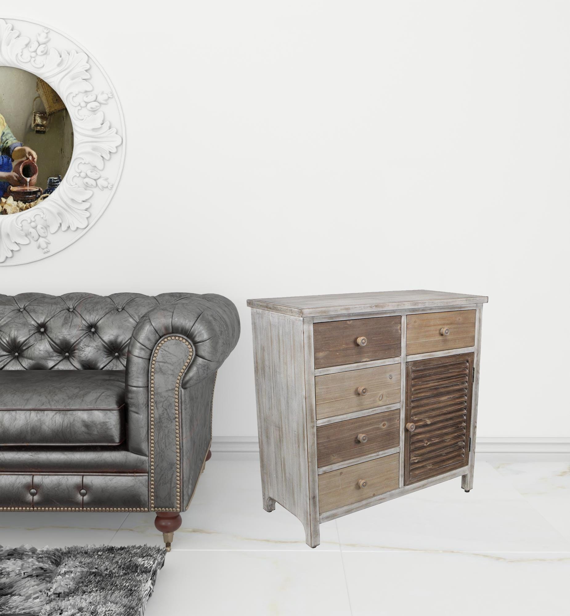 Distinctive in style the 32" brown rustic solid wood end table cabinet with five drawers radiates a versatile charm. This table is made from solid wood in multiple shades of rustic and natural brown color throughout the base and top. Side tables are a great way to flank your sofa, use as an accent next to your favorite chair, or can even be used bedside. You can also use it as an entryway table to hold your keys or in hallway or dining room. 31.5" H x 31.75" W x 15" D