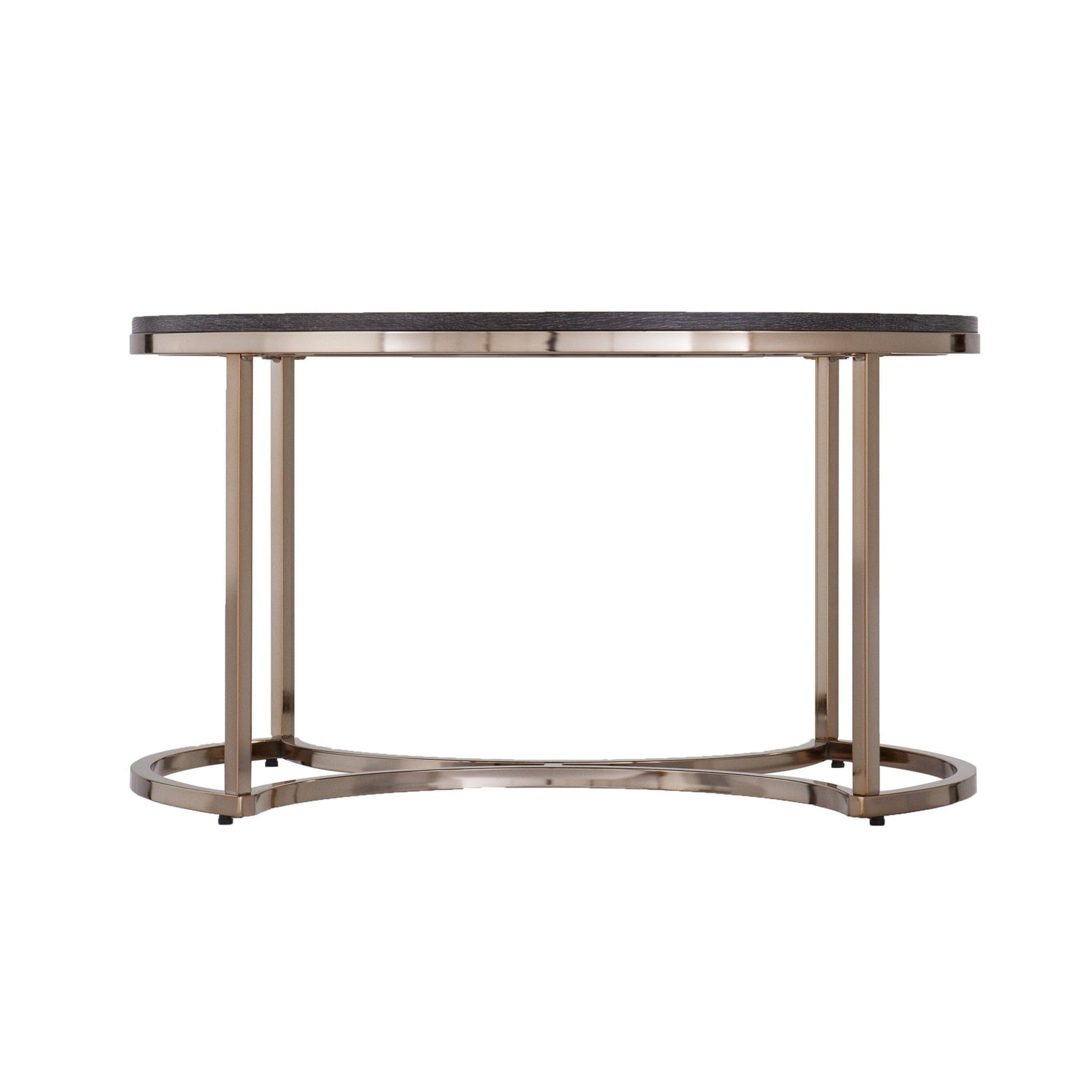 Stylish and super sturdy, the 32" champagne and charcoal manufactured wood and metal with iron round coffee table is an amazingly good looking coffee table that will compliment your living room. A champagne metal frame is finished off with a charcoal manufactured wood top that is the epitome of quality construction and design. This round table features a fresh and stylish shape to give your room a visually pleasing accent. If you're looking for something that can fit into a living area, bedroom, or office, this coffee table is for you. This coffee table is the sturdy, reliable and stylish answer to your living room needs. 18" H x 32" W x 32" D