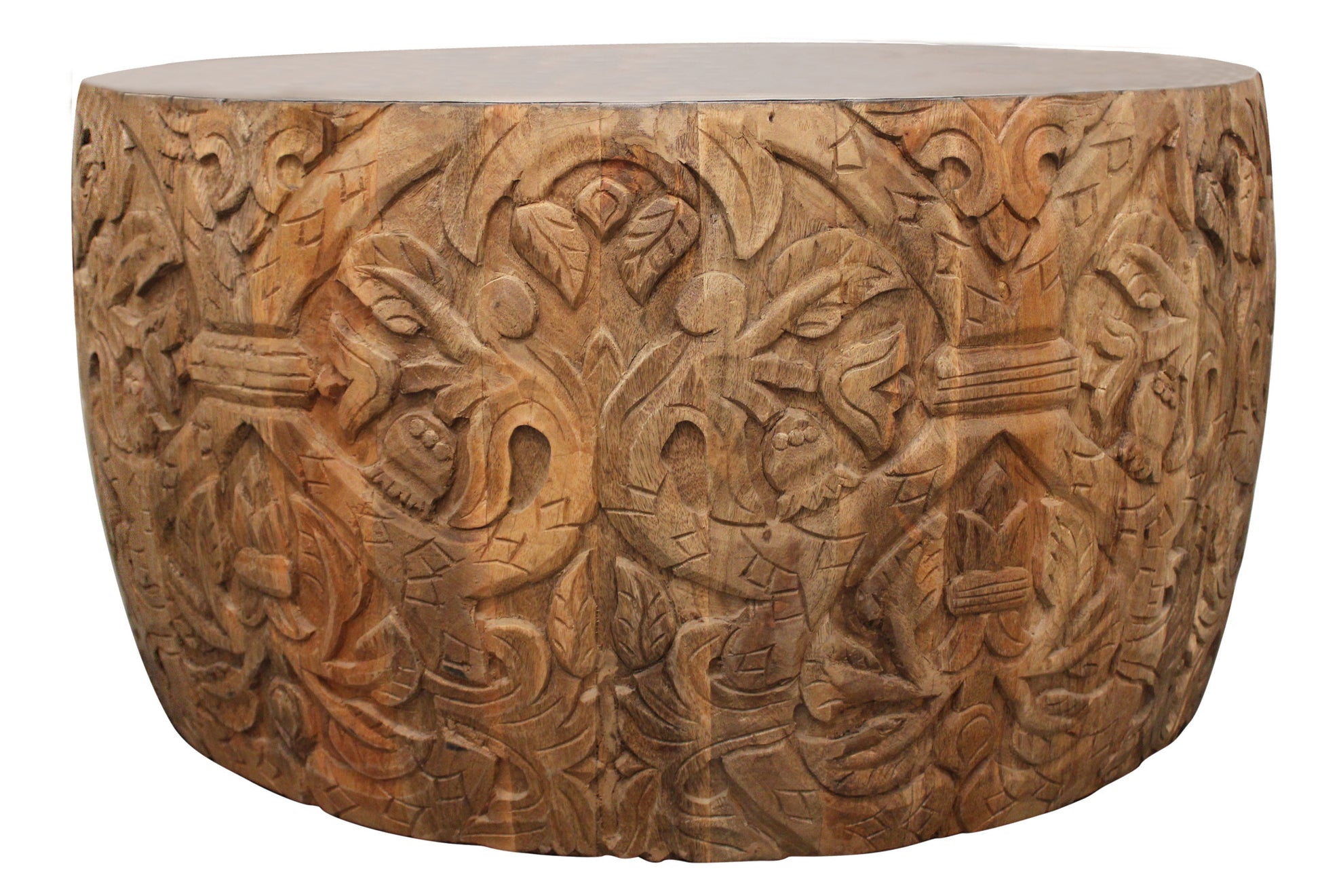 32" Natural Brown And White Wash Hand Carved Wood Round Coffee Table