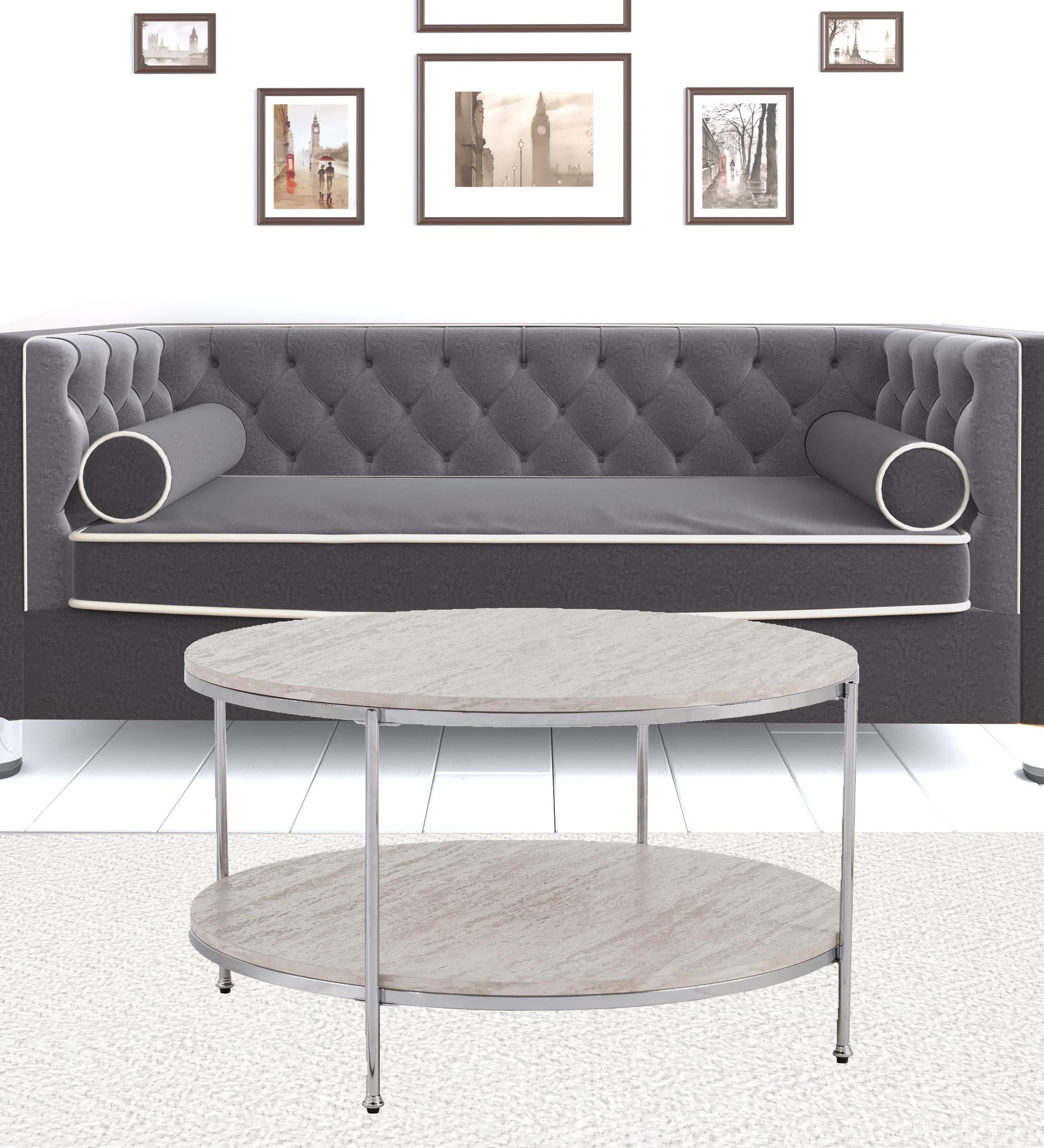 Add handsome, fashionable design to your living space with this 33" chrome faux marble and metal round coffee table. This multi-functional coffee table is built to last from high quality faux marble and metal. This two tier round table utilizes its unique shape to give your room a modern geometric accent. If you're looking for something that can fit both into a living area, bedroom, or office, this coffee table is for you. This coffee table is the sturdy, reliable and stylish answer to your living room needs. 18.5" H x 33.25" W x 33.25" D