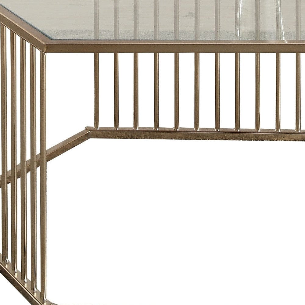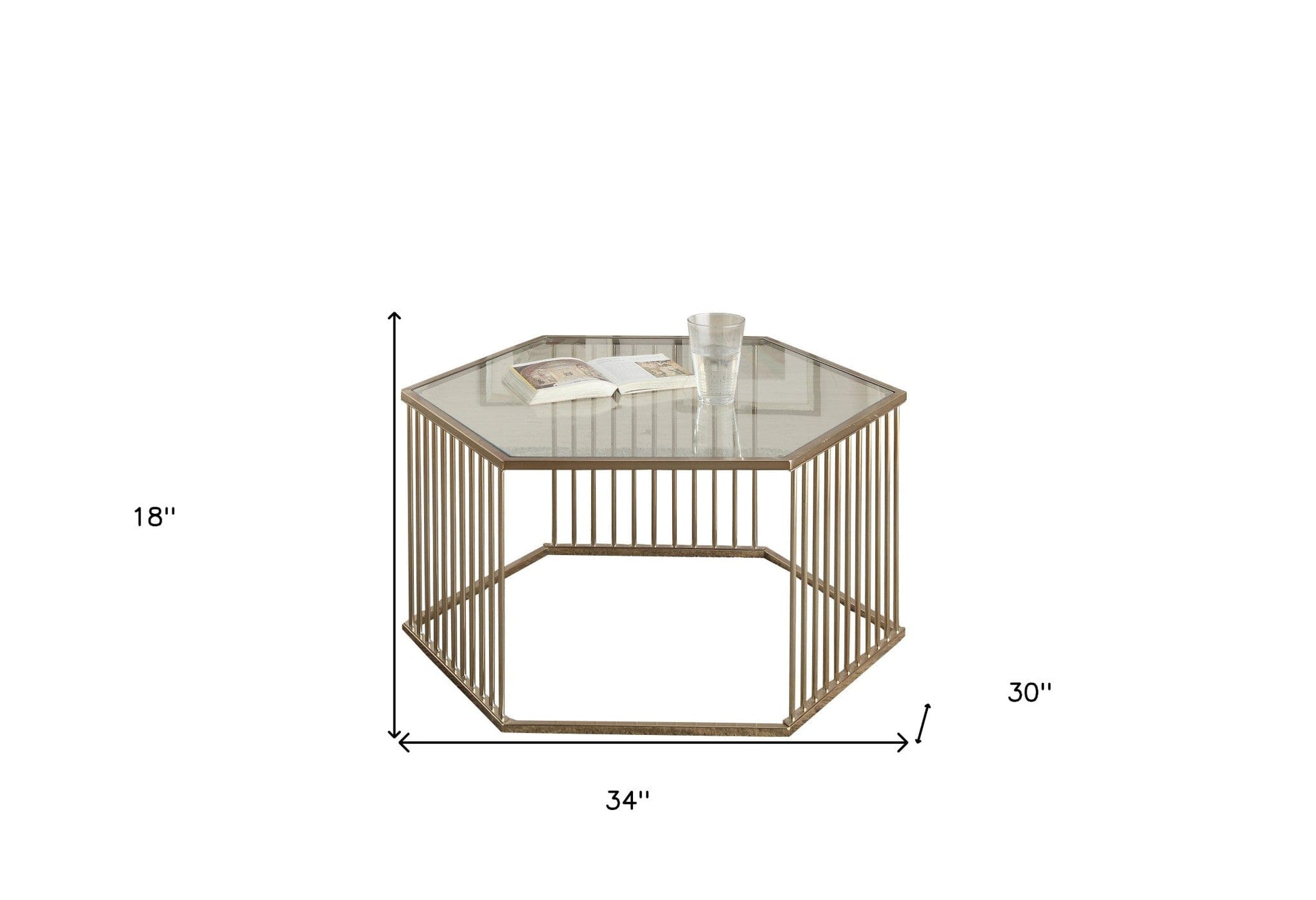 34" Champagne And Clear Glass And Metal Hexagon Coffee Table
