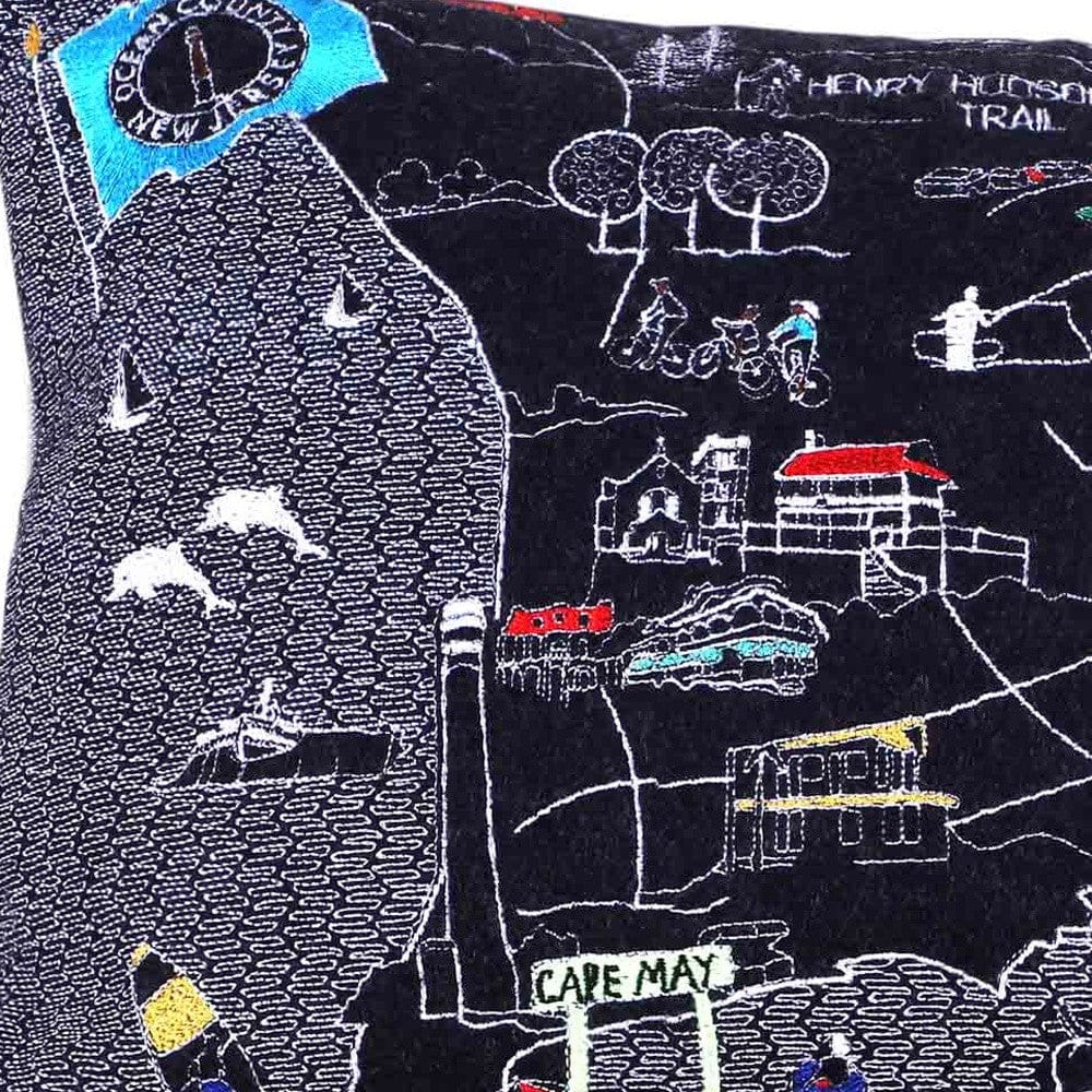 Showcase this famous city, with our Black Color South Jersey Shore Nighttime Skyline Queen Size Lumbar Decorative Pillow. The Nighttime view of the South Jersey Shore is picture perfect. The gorgeous art features many famous beach towns and references for this famous shoreline that includes Point Pleasant, LBI, Atlantic City, Sea Isle, and Cape May and more, rendering a modern whimsical way to bring this beautiful coastal vacation spot to life. Made of a wool/nylon blend, this high quality stitched decorative pillow features white on black embroidered artwork mixed with pops of color that highlight important and recognizable icons from these popular New Jersey beaches. This pillow makes a great gift, decorative accent and conversation piece. 4" x 35" x 14"