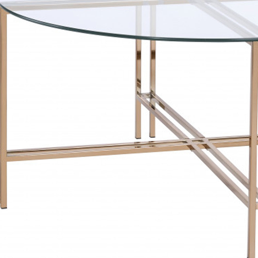 This good looking 35" champagne and clear glass and metal round coffee table is not only practical, but good looking and built to last. The clear glass top of this table is a nice visual contrast to the high quality, champagne metal of the base. This round table features a fresh and stylish shape to give your room a visually pleasing accent. It has a fresh design that will definitely breathe some fresh air into your interior. This coffee table is the sturdy, reliable and stylish answer to your living room needs. 18" H x 35" W x 35" D
