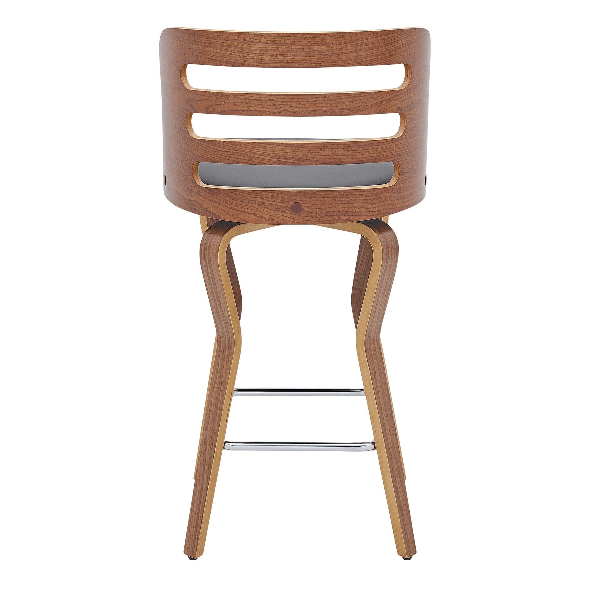 Comfortable enough to sit in for awhile, this 35" gray faux leather and manufactured wood swivel counter height bar chair will transcend the look of your room. The walnut coloration of the high quality manufactured wood base marries nicely with the gray faux leather seat. A full back mixed with a round shaped seat design makes this chair both comfortable and fashionable. A great seating option, this stool will bring a unique look to any room. 35" H x 18" W x 19" D