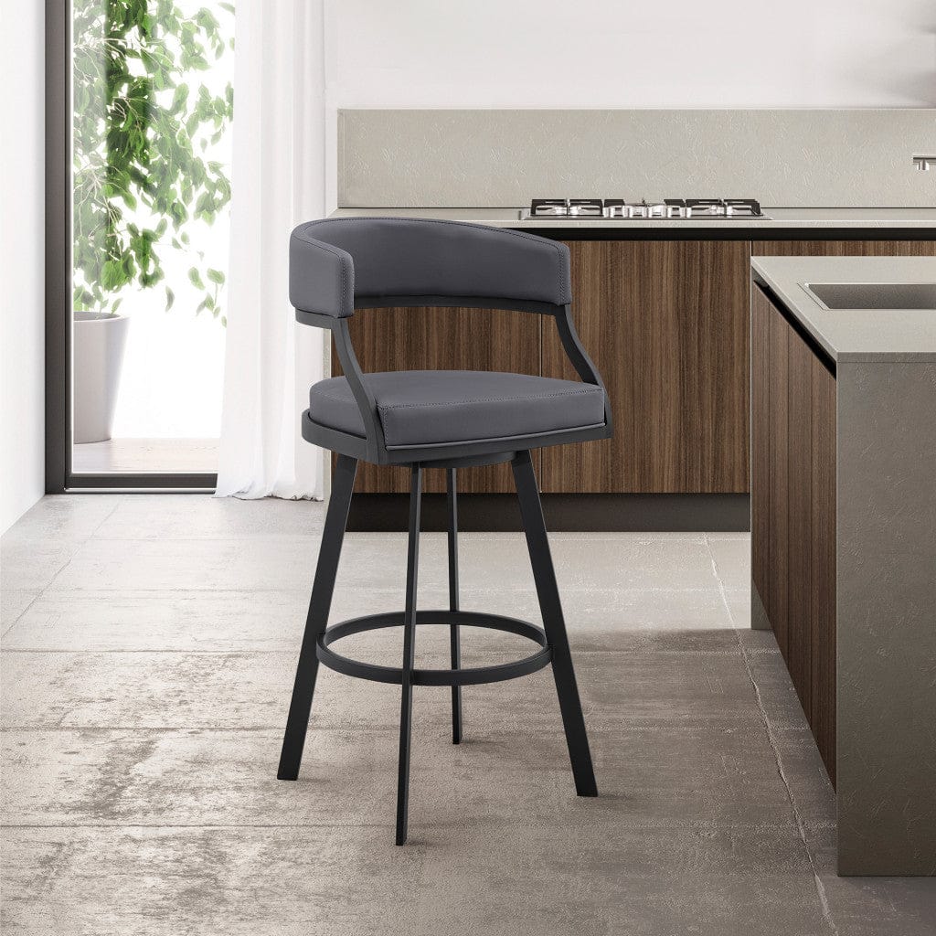 Bring a trendy bar vibe to your space, with this 35" grey faux leather and iron swivel low back counter height bar chair. Quality construction from black iron combines with grey faux leather to give this stool a fresh and updated look. The round shape of the seat combines with a low back to give this chair a comfortable and fashionable look. The armchair design gives you a great place to comfortably rest your arms. 35" H x 20" W x 21" D