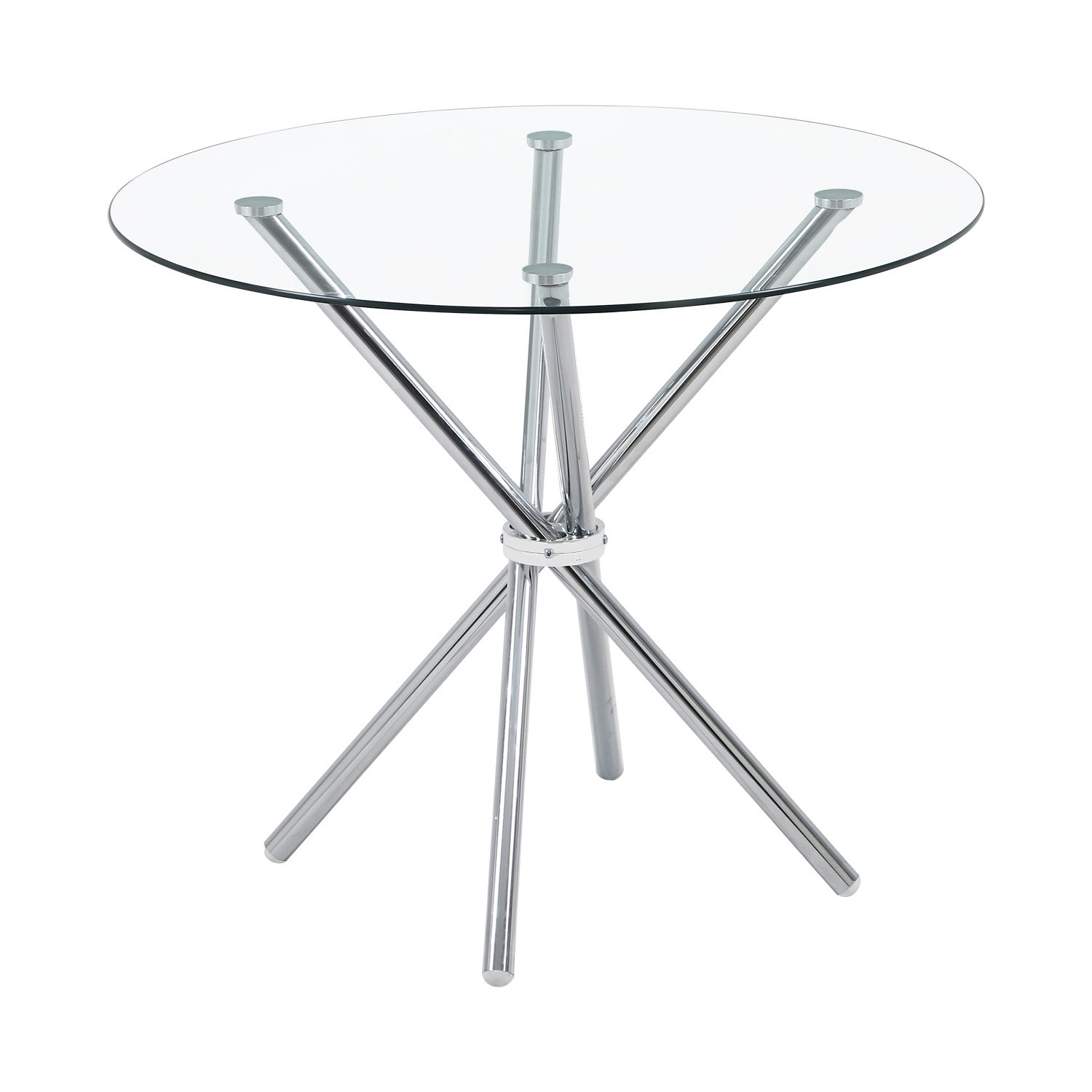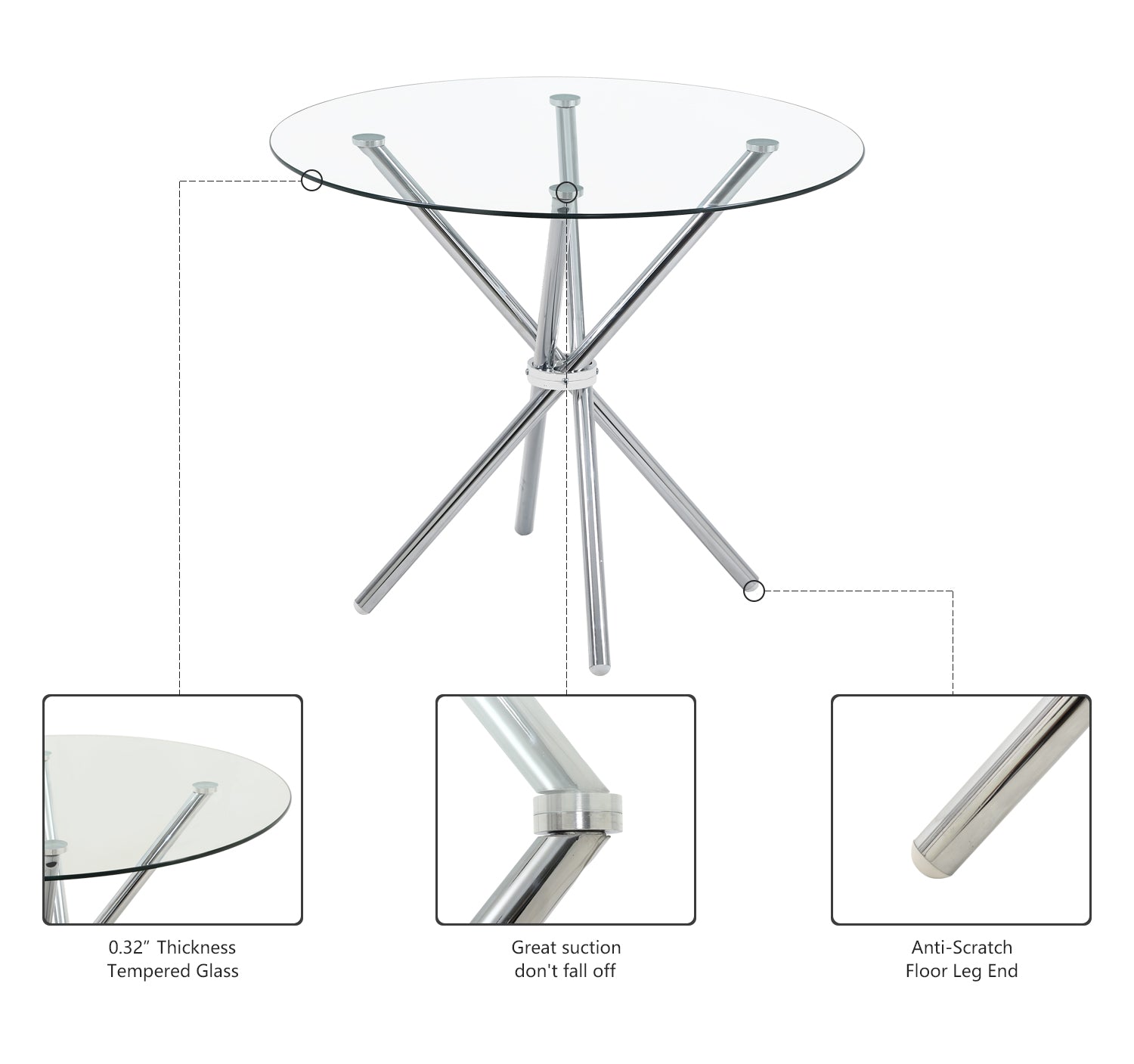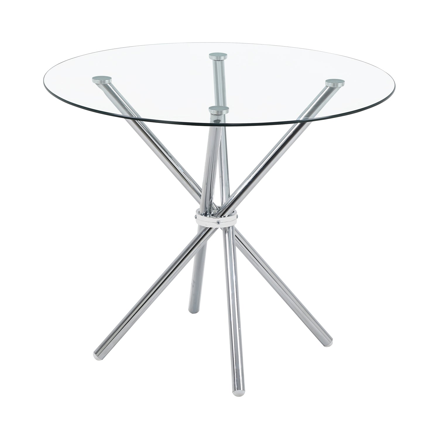 Make a statement with the 35" silver and glass contemporary round coffee table and infuse a dash of character and personality into your space. The clear glass top of this table is a nice visual contrast to the high quality, shiny silver metal of the base. This round table features a unique shape pairing with four open and airy legs on the bottom to give your room a visually pleasing accent. Offering a nice color combination, the top of this table is table is clear, while the base compliments it nicely in silver. If you're looking for something that can fit both into a living area, bedroom, or office, this coffee table is for you. This coffee table is the sturdy, reliable and stylish answer to your living room needs. 29.5" H x 35.4" W x 35.4" D
