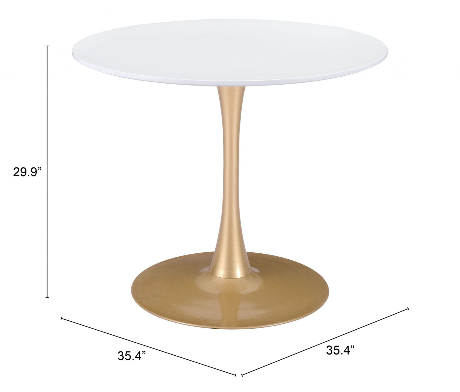 Stylish and super sturdy, the 35" white and gold rounded manufactured wood and steel dining table is an amazingly good-looking dining table that was made to become the centerpiece of your home. The gold coloration of the high quality steel base marries nicely with the white manufactured wood top surface. The two-tone finish gives it a fresh and updated look. A beautiful pedestal base adds some dimension and elegance to your dining. Seat up to 4 family and friends around your new dining table. This table is the sturdy, reliable and stylish answer to your dining room needs. The dining table plays a central part in your home. This design is a great way for you to enjoy dining and entertaining in style. 29.9" H x 35.4" W x 35.4" D