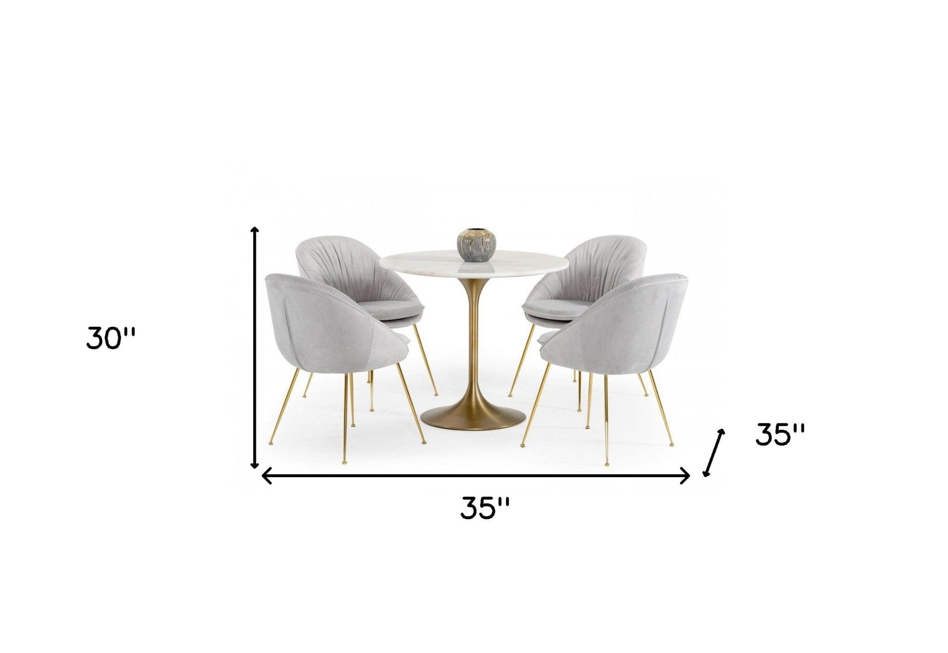 Make a statement with the 35" white and gold rounded marble and metal dining table and infuse a dash of character and personality into your space. Quality construction from the gold metal base combines with white marble of the top to give this table a fresh and updated two-tone look. A beautiful pedestal base adds some dimension and elegance to your dining. This dining table seats 4 people comfortably. Complete your kitchen or dining room with this well made and stylish table. The dining table is a symbol for togetherness, special meals, and conversation. This 35" white and gold rounded marble and metal dining table is a must-have for your home. 30" H x 35" W x 35" D