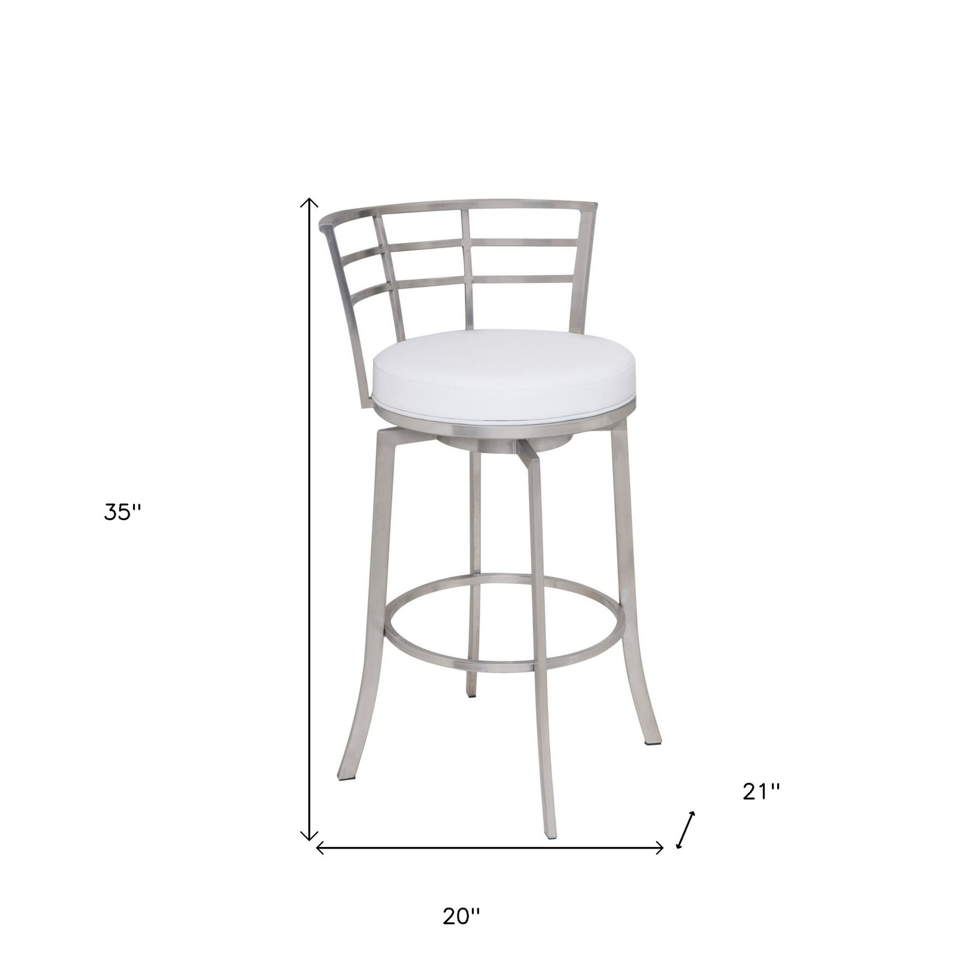 Comfortable enough to sit in for awhile, this 35" white faux leather and iron swivel low back counter height bar chair will transcend the look of your room. The base of this stool is made from iron in a brushed stainless steel color that is a nice contrast to the white faux leather seat. The round shape of the seat combines with a low back to give this chair a comfortable and fashionable look. A great seating option, this stool will bring a unique look to any room. 35" H x 20" W x 21" D