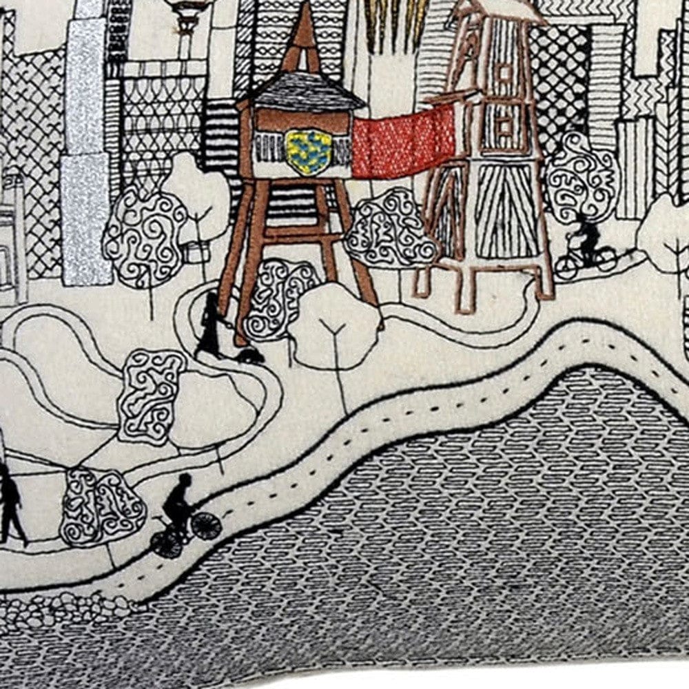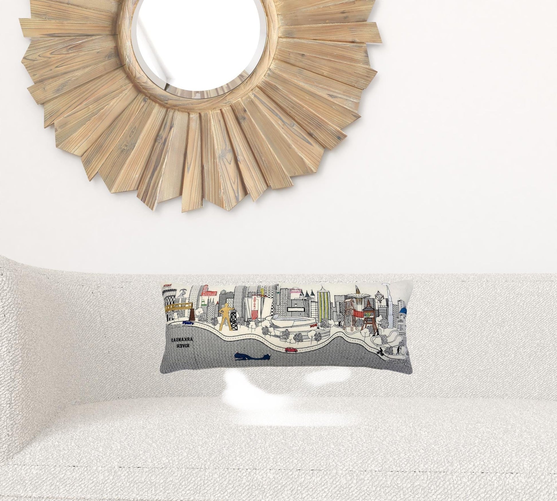 Showcase this famous city, with our Cream Color Tulsa Daylight Skyline Queen Size Lumbar Decorative Pillow. The daylight view of Tulsa from the Arkansas River, is picture perfect. The gorgeous art features many famous landmarks and references for this destination city, rendering a modern whimsical way to bring this iconic cityscape to life. Made of a wool/nylon blend, this high quality stitched decorative pillow features black on white embroidered artwork mixed with pops of color that highlight important and recognizable icons from this popular and bustling city. This pillow makes a great gift, decorative accent and conversation piece. 4" x 35" x 14"