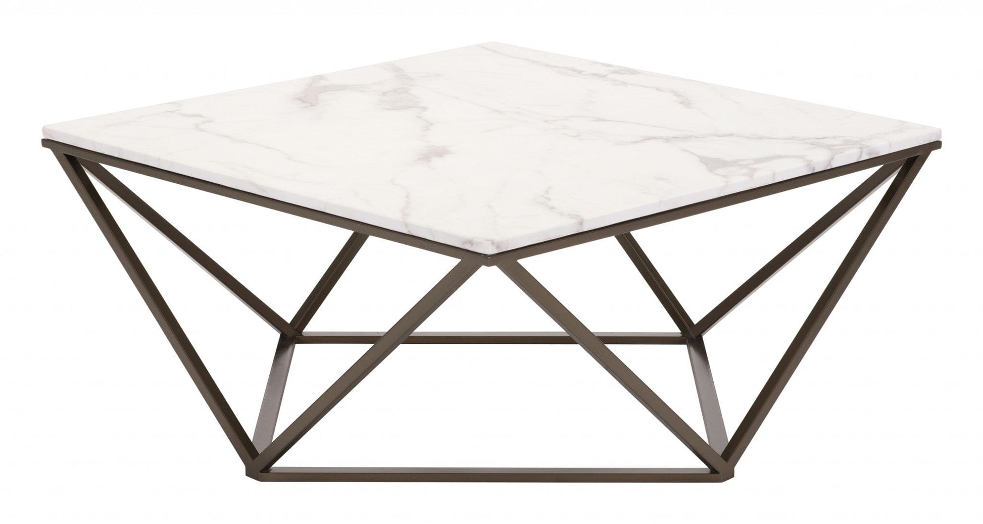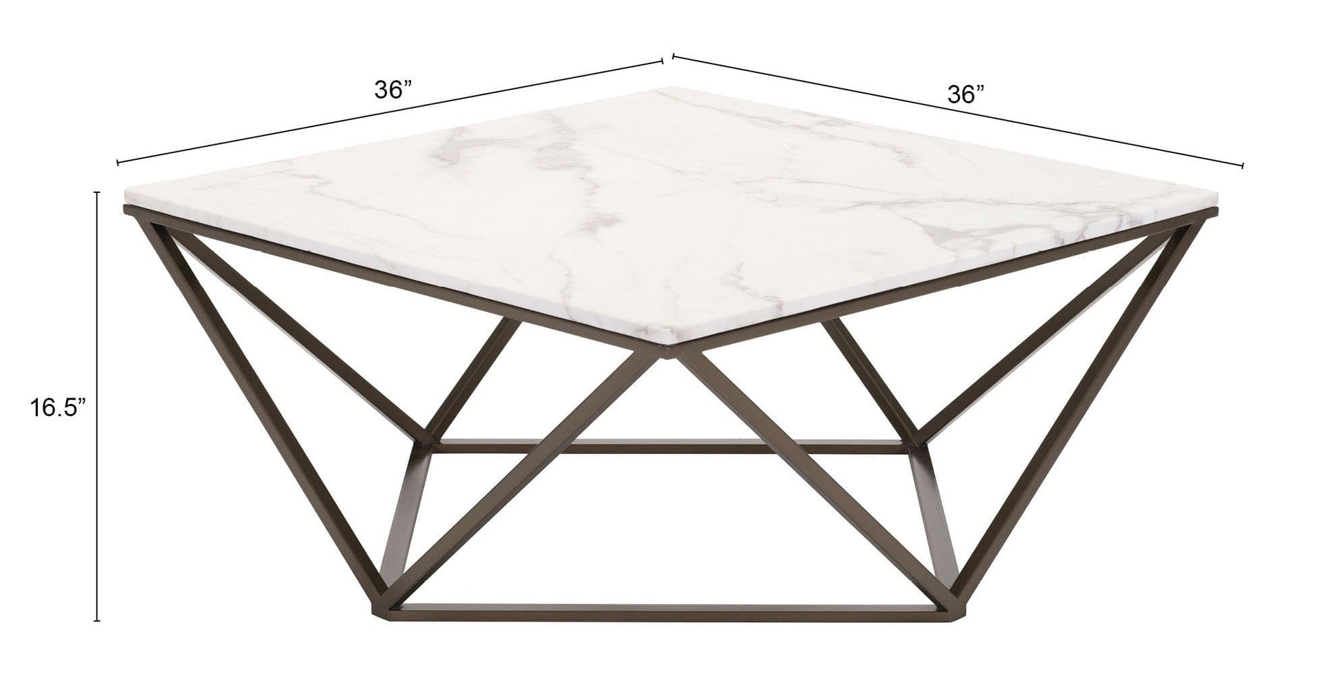 This good looking 36" antique brass and white stone square coffee table is not only practical, but good looking and built to last. The white stone top of this table is a nice visual contrast to the high quality, antique brass steel of the base. This square table utilizes its unique shape to give your room a modern geometric accent. If you're looking for something that can fit into a living area, bedroom, or office, this coffee table is for you. This coffee table is the sturdy, reliable and stylish answer to your living room needs. 16.5" H x 36" W x 36" D