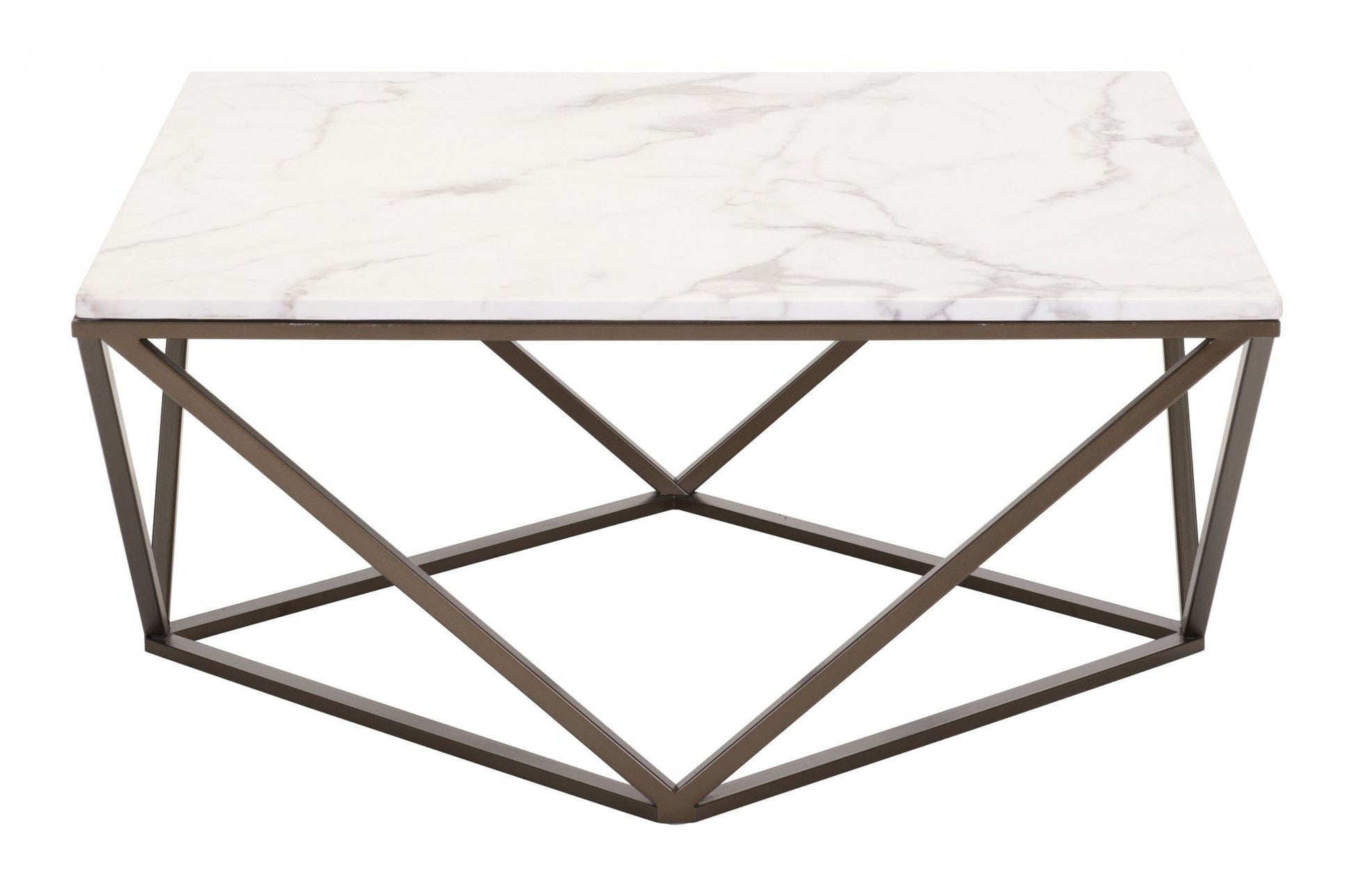36" Antique Brass And White Faux Marble Stone Coffee Table