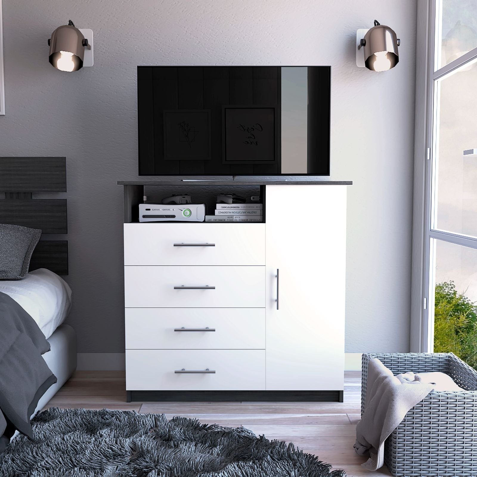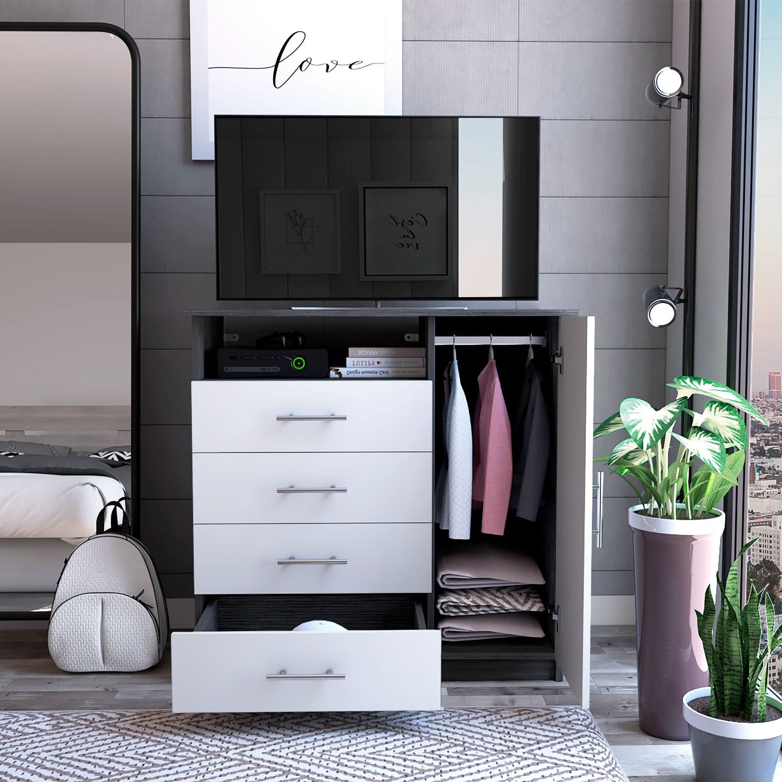 Make your room functional and visually enticing with this masterful 36" manufactured wood four drawer standard dresser. Equipped with four easy open drawers for practical and good looking clothing storage. Its a high quality piece, made from high grade manufactured wood. 34.9" H x 35.83" W x 18" D