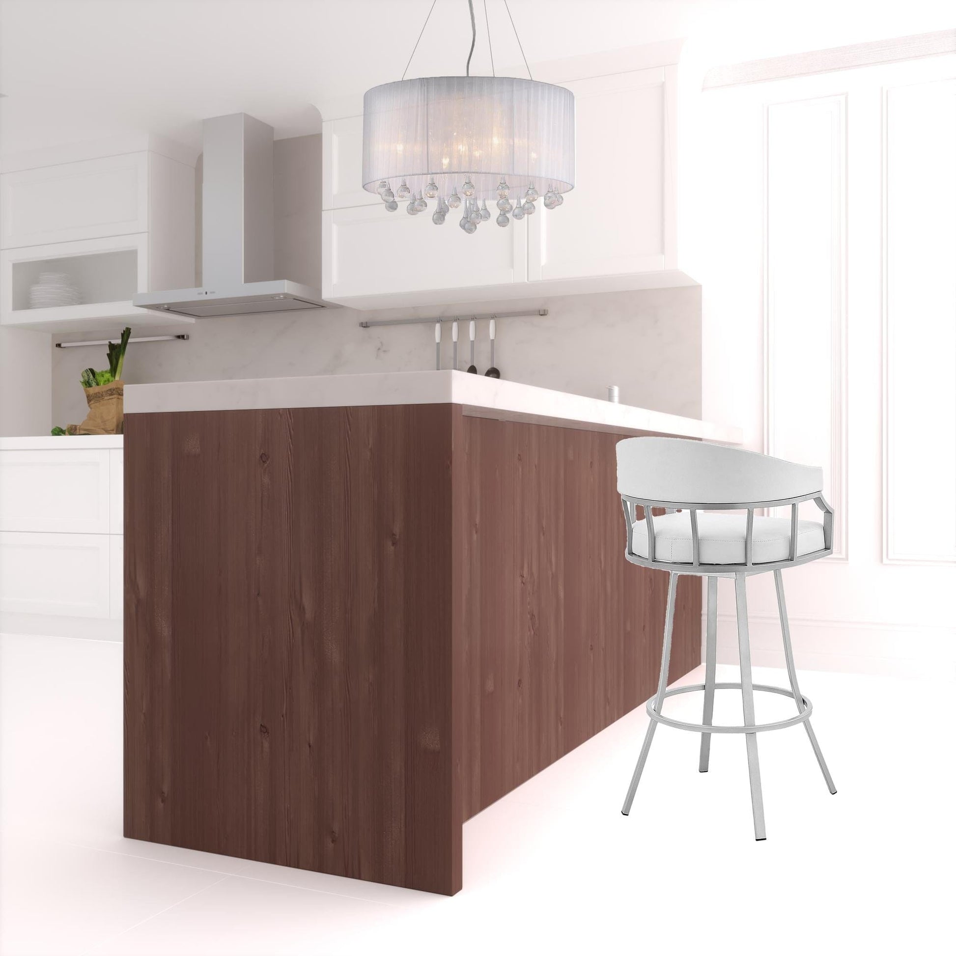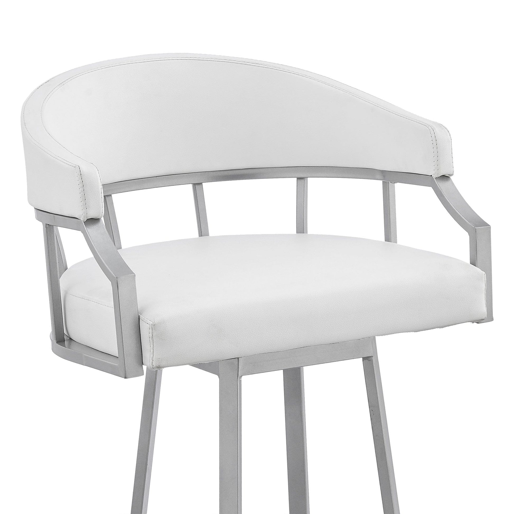 This 36" white faux leather and iron swivel low back counter height bar chair will be the perfect way to add some cool design and utility to your space similar to what you find in your favorite cafes or pubs. The white faux leather seat of this stool is a nice contrast to the high quality, silver iron of the base. A low back mixed with a round shaped seat design makes this chair both comfortable and fashionable. The armchair design gives you a great place to comfortably rest your arms. 36" H x 21" W x 21" D