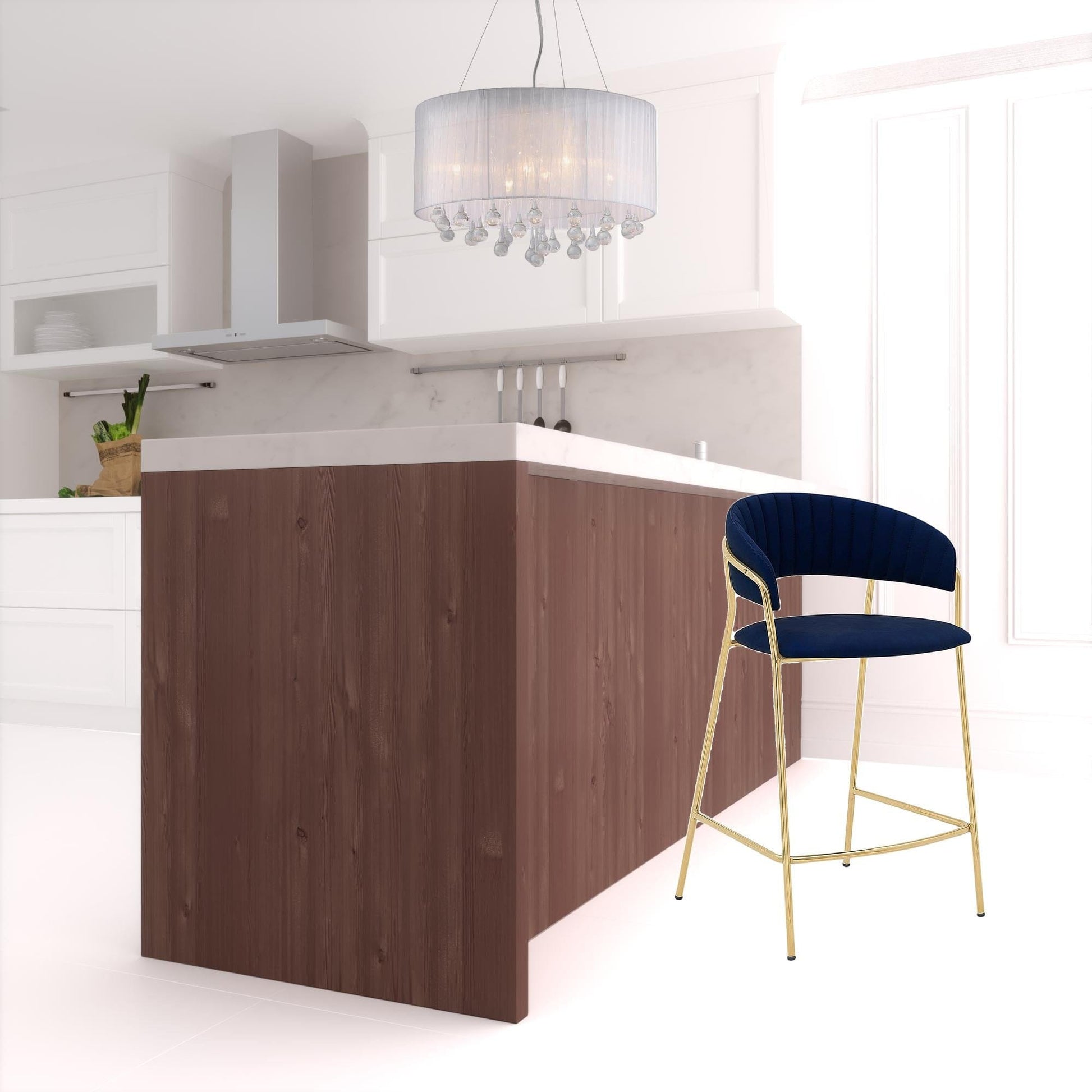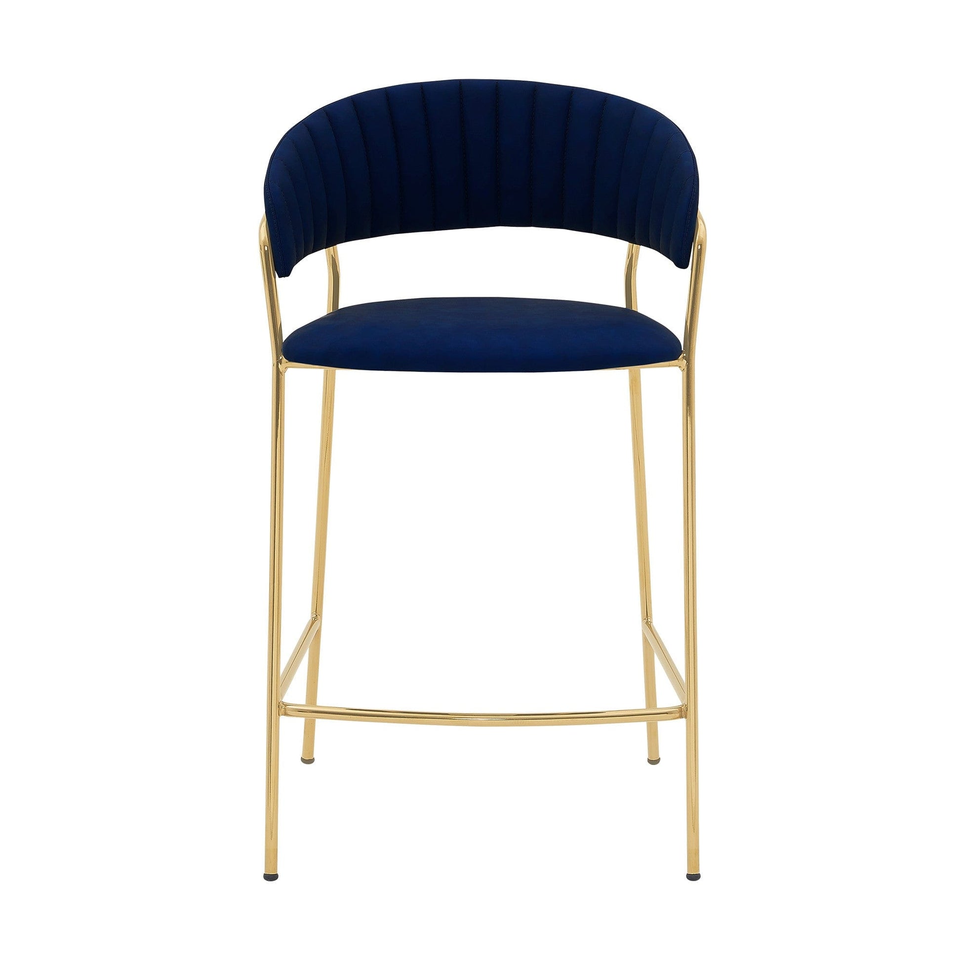 This 37" blue faux leather and iron low back counter height bar chair will be the perfect way to add some cool design and utility to your space similar to what you find in your favorite cafes or pubs. The blue faux leather seat of this stool is a nice contrast to the high quality, gold chrome iron of the base. Not only good looking and stylish, this chair features a round shaped seat and a low back for the ultimate in comfort and enjoyment. This stool will look great in your dining room, kitchen, bar, or recreation room. 36.5" H x 20.5" W x 20.5" D