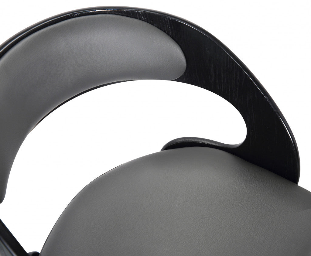 Comfortable enough to sit in for awhile, this 37" gray faux leather and iron swivel counter height bar chair will transcend the look of your room. A black iron frame is finished off with a gray faux leather seat that is the epitome of quality construction and design. Not only good looking and stylish, this chair features a round shaped seat and a full back for the ultimate in comfort and enjoyment. This stool will look great in your dining room, kitchen, bar, or recreation room. 37" H x 18" W x 18" D