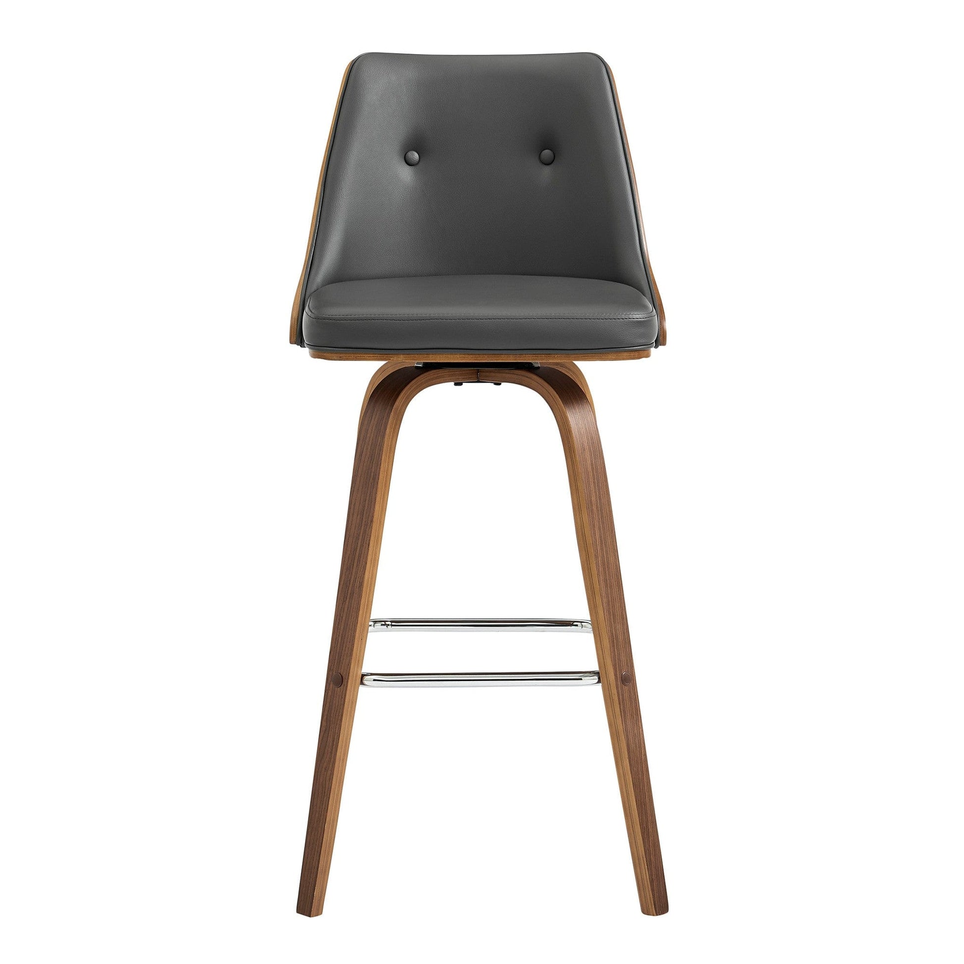 The perfect way to add some extra seating in your home, this 37" gray faux leather and manufactured wood swivel counter height bar chair will elevate the look and vibe of your room. The gray faux leather seat of this stool is a nice contrast to the high quality, walnut manufactured wood of the base. A full back mixed with a round shaped seat design makes this chair both comfortable and fashionable. A great seating option, this stool will bring a unique look to any room. 37" H x 19" W x 20" D