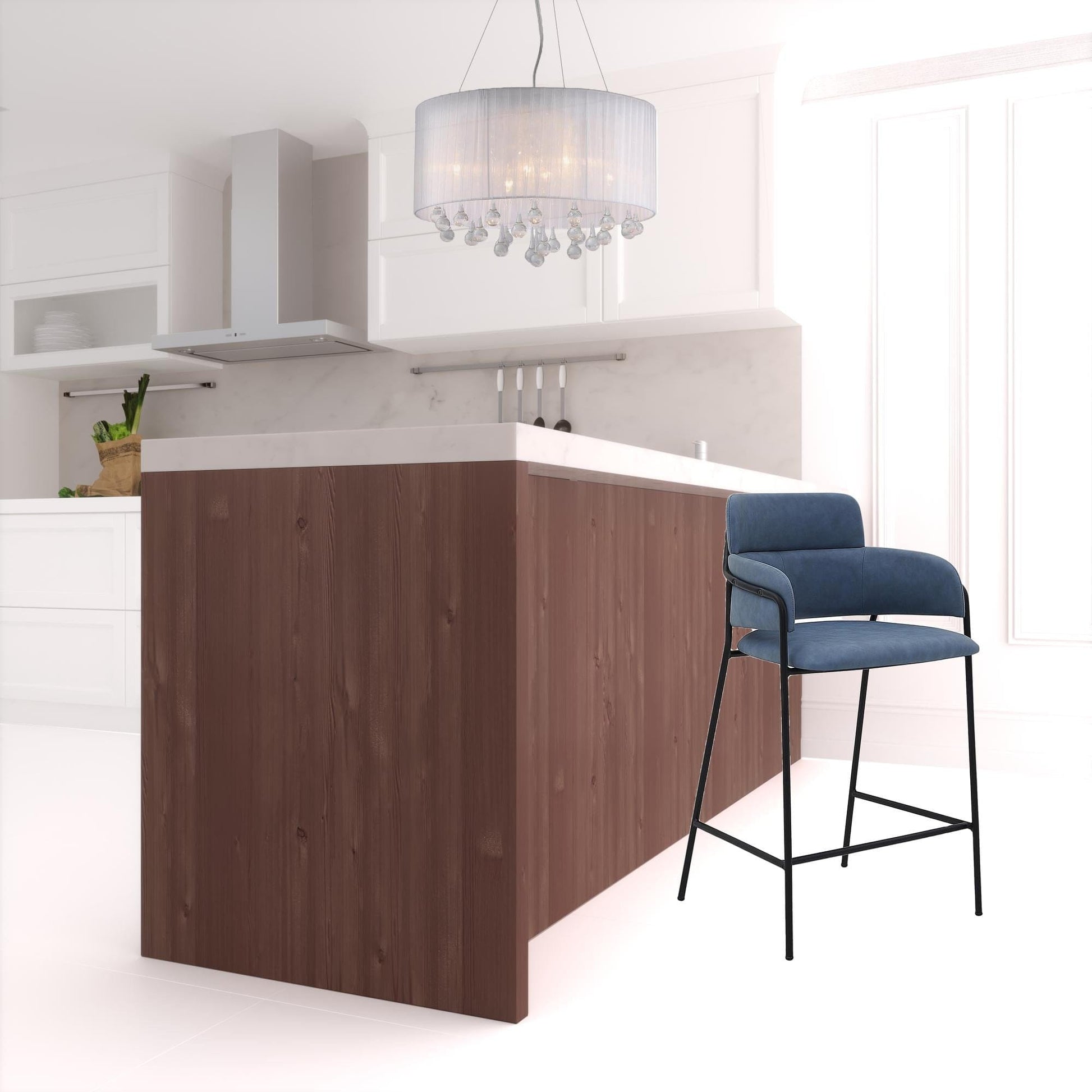 Comfort and design come together nicely in this 37" light blue faux leather and iron counter height bar chair. Quality construction from black full matte powder coated iron combines with light blue faux leather to give this stool a fresh and updated look. Not only good looking and stylish, this chair features a round shaped seat and a full back for the ultimate in comfort and enjoyment. This stool will look great in your dining room, kitchen, bar, or recreation room. 36.5" H x 22.5" W x 21" D
