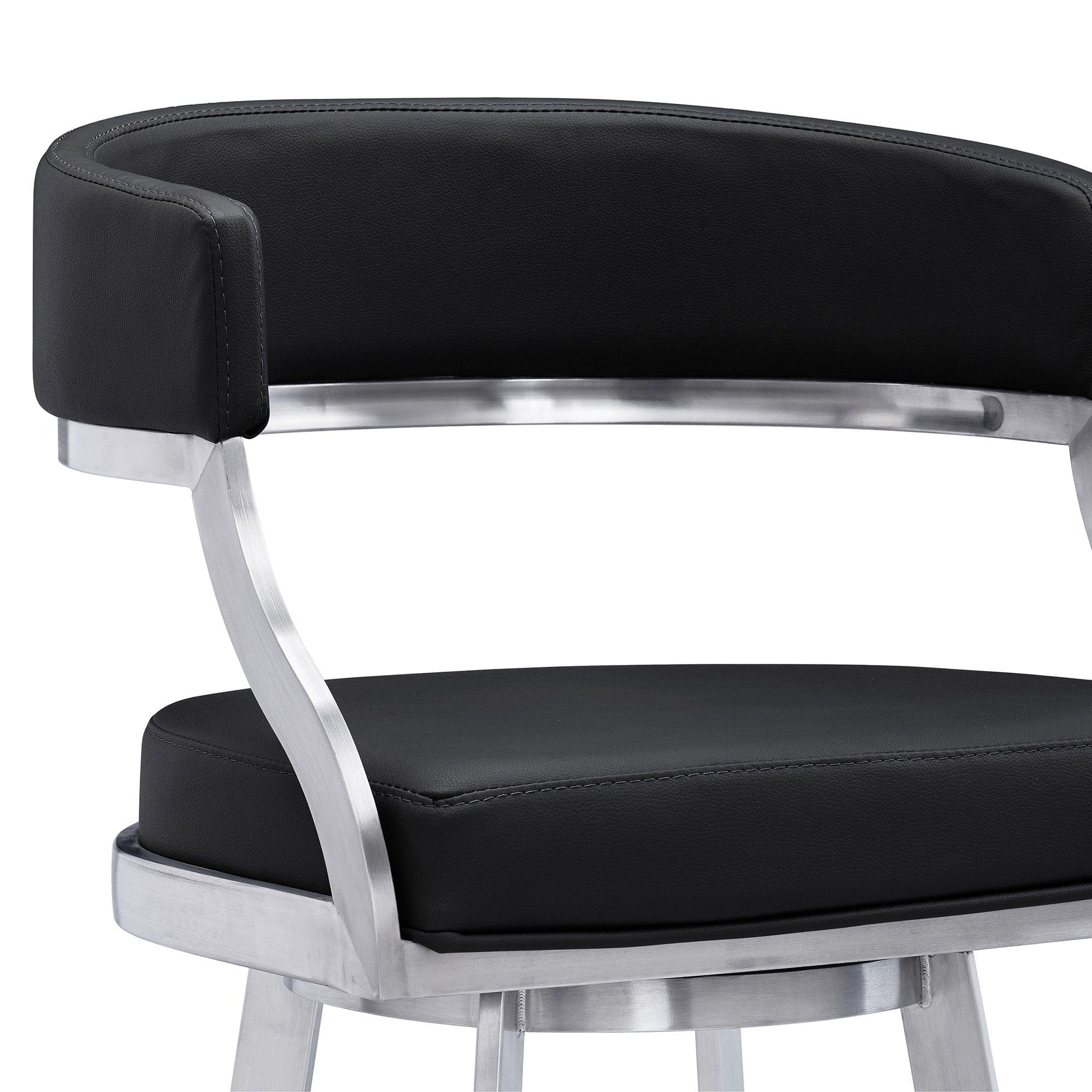 The perfect way to add some extra seating in your home, this 38" black faux leather and iron swivel counter height bar chair will elevate the look and vibe of your room. The black faux leather seat of this stool is a nice contrast to the high quality, brushed stainless steel iron of the base. Not only good looking and stylish, this chair features a round shaped seat and a full back for the ultimate in comfort and enjoyment. The armchair design gives you a great place to comfortably rest your arms. 38" H x 21" W x 20" D