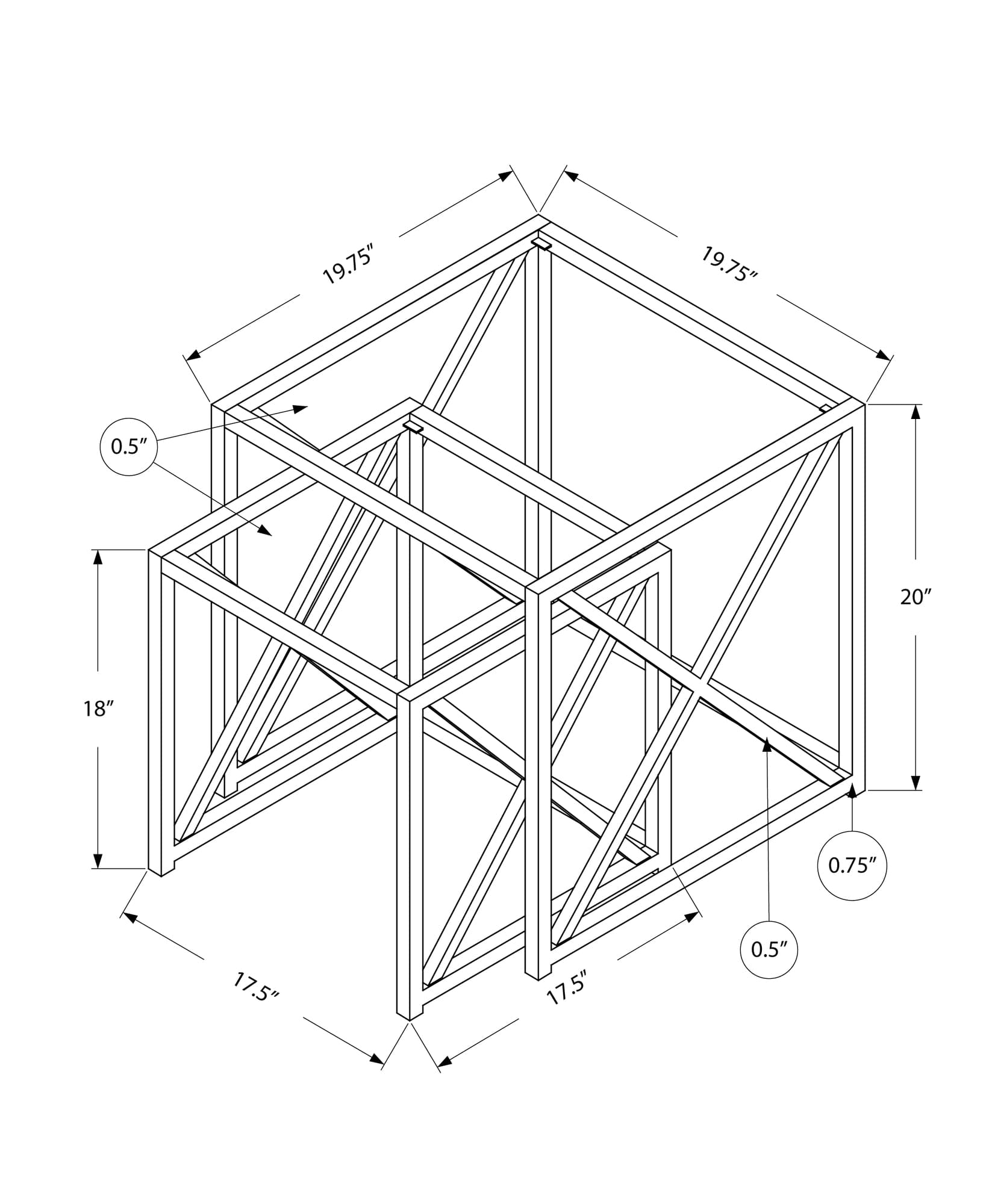 Make better the appearance and atmosphere of your home with something both useful and delectable with this lovely nesting table. Its captivating design will surely be an outstanding decoration as well. This nesting table is superbly made from high grade metal and tempered glass. It's a long-lasting piece, certain to serve you well for years to come. The thorough attention devoted to details in this nesting table and its obvious quality will add a flare of creativity to the ambiance of your home. As for measurements, they are 38' for height, 37.25' for width, and 37.25' for depth, and it weighs 30 pounds. It's a fashionable ornament and a perfect choice to beautify your home. It would fit great in your hallway, living room, or lounge, for example. This is a set of two.