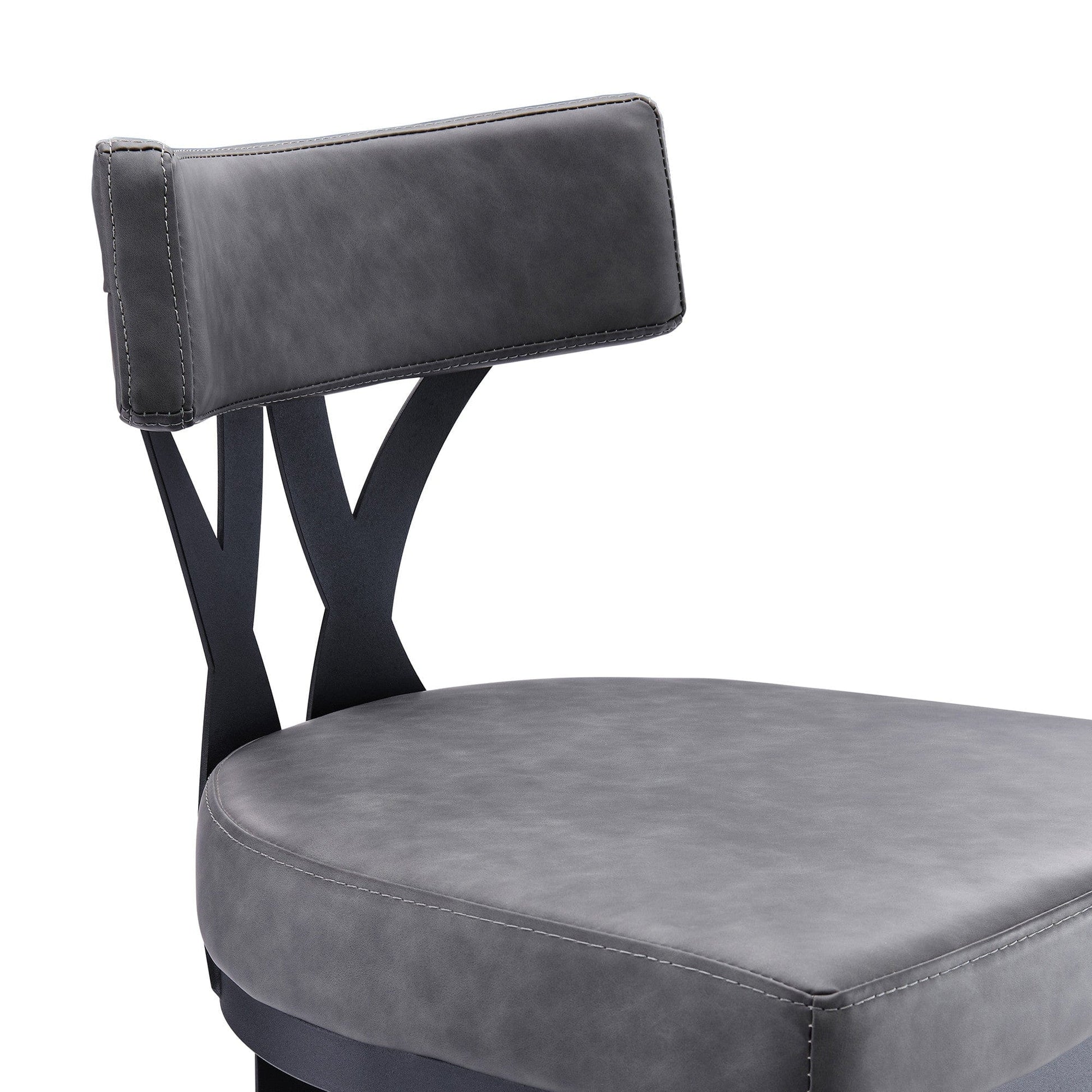 Comfort and design come together nicely in this 38" gray faux leather and iron counter height bar chair. A black powder coated iron frame is finished off with a gray faux leather seat that is the epitome of quality construction and design. A full back mixed with a round shaped seat design makes this chair both comfortable and fashionable. A great seating option, this stool will bring a unique look to any room. 38" H x 19" W x 20" D