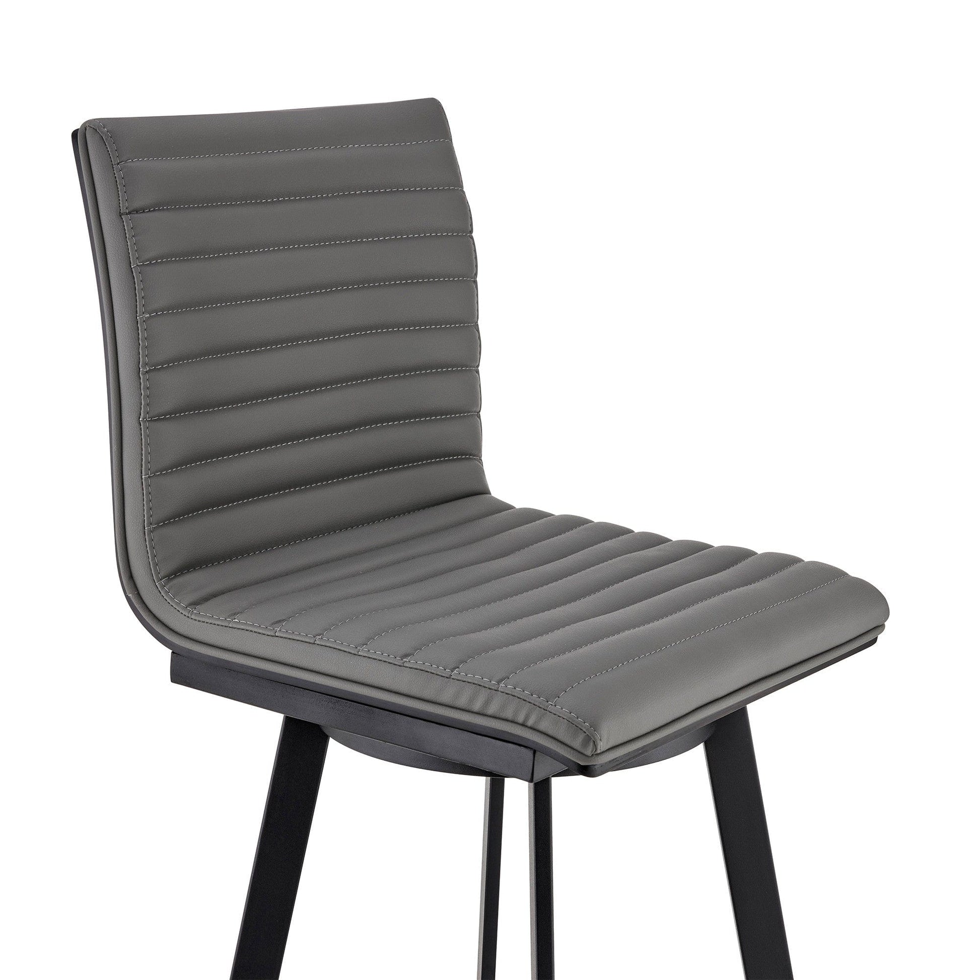 Bring a trendy bar vibe to your space, with this 39" gray faux leather and iron swivel counter height bar chair. Quality construction from black finish paint frame iron combines with gray faux leather to give this stool a fresh and updated look. Not only good looking and stylish, this chair features a round shaped seat and a full back for the ultimate in comfort and enjoyment. The armchair design gives you a great place to comfortably rest your arms. 39" H x 17" W x 21" D