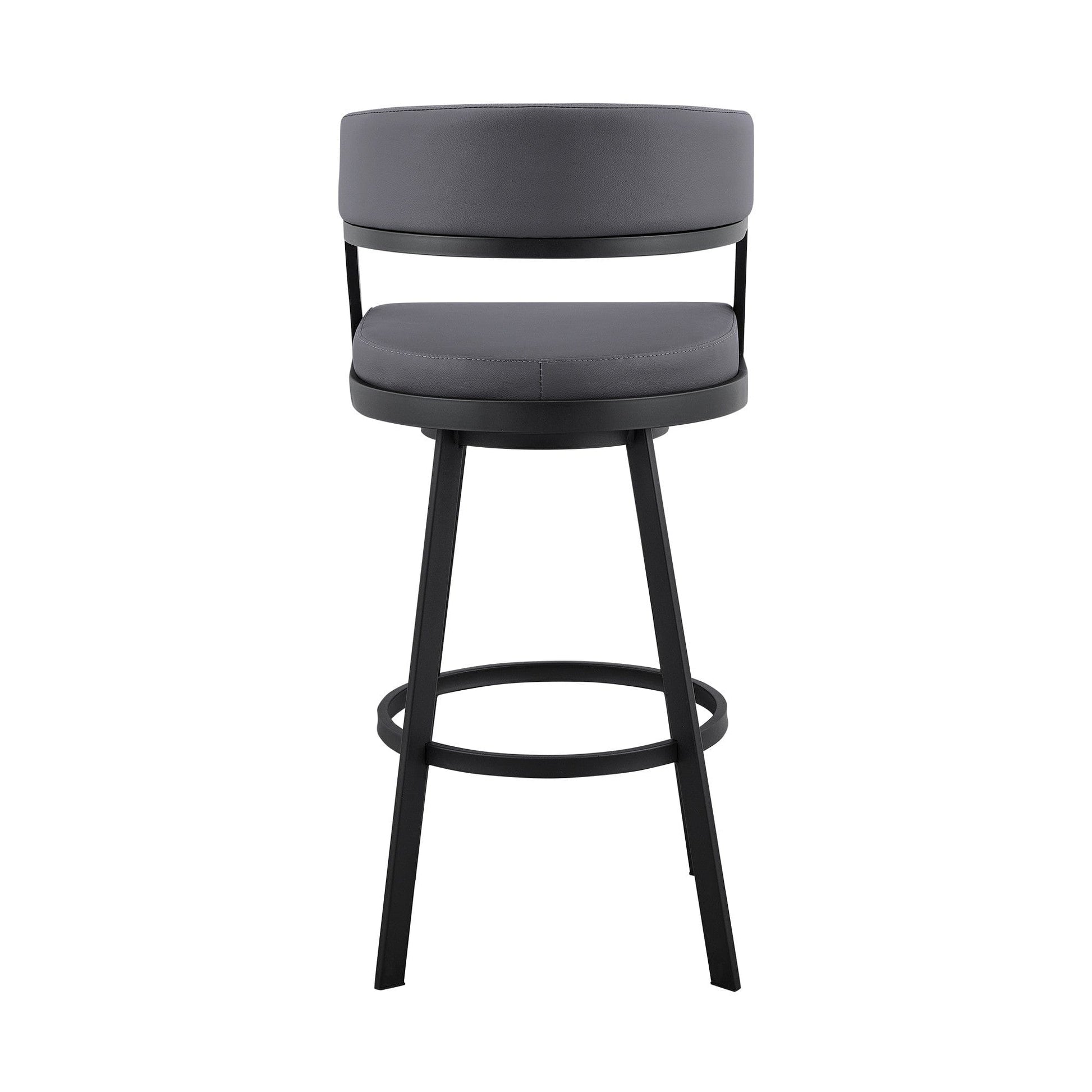Comfort and design come together nicely in this 39" grey faux leather and iron swivel low back bar height chair. Quality construction from black iron combines with grey faux leather to give this stool a fresh and updated look. A low back mixed with a round shaped seat design makes this chair both comfortable and fashionable. The armchair design gives you a great place to comfortably rest your arms. 39" H x 20" W x 21" D