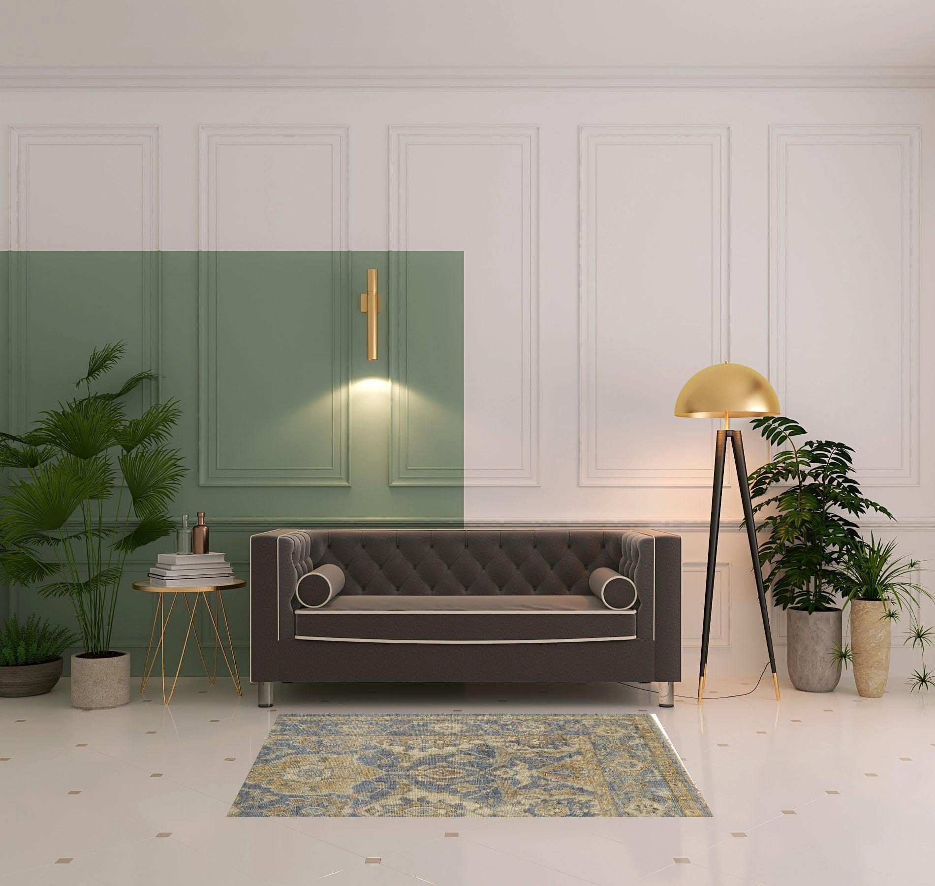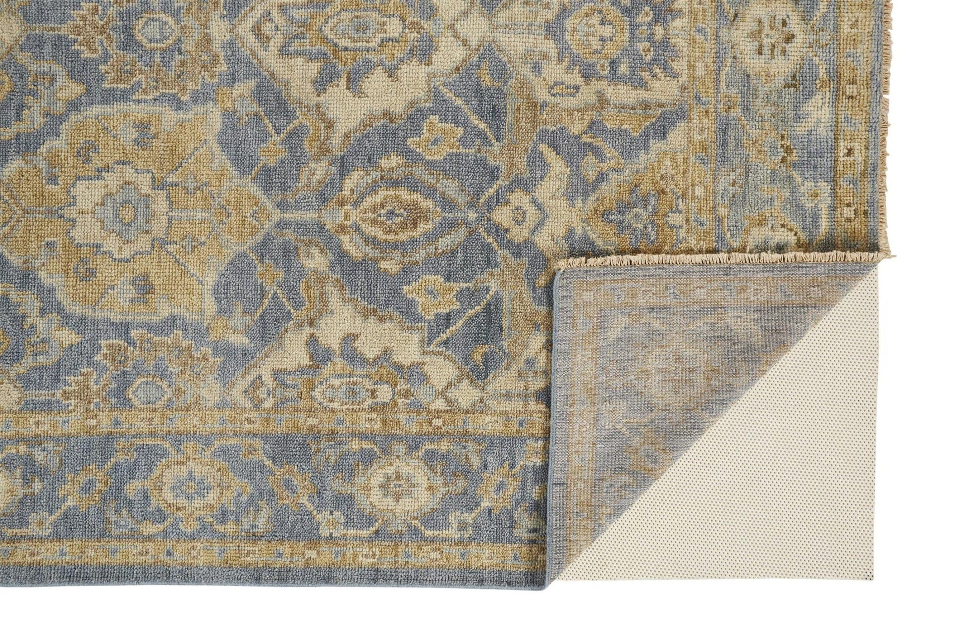 Add some artistry to your room with this 4' x 6' blue gold and tan wool floral hand knotted stain resistant area rug with fringe. This rectangle shaped rug features a floral design in blue gold and tan to give it visual interest. A classic shape marries with good looking design for your space Ideal for spaces with kids and pets, this rug is stain resistant to help repel stains and spilled liquids. Tassel ends bring a timeless and fashionable look to your interior. Crafted by skilled artisans, this hand knotted rug is genuine and unique. No two will be exactly alike. Place this area rug against a hardwood or tile floor and it will enliven your living space with style and sophistication. 0.28" H x 42" W x 66" D