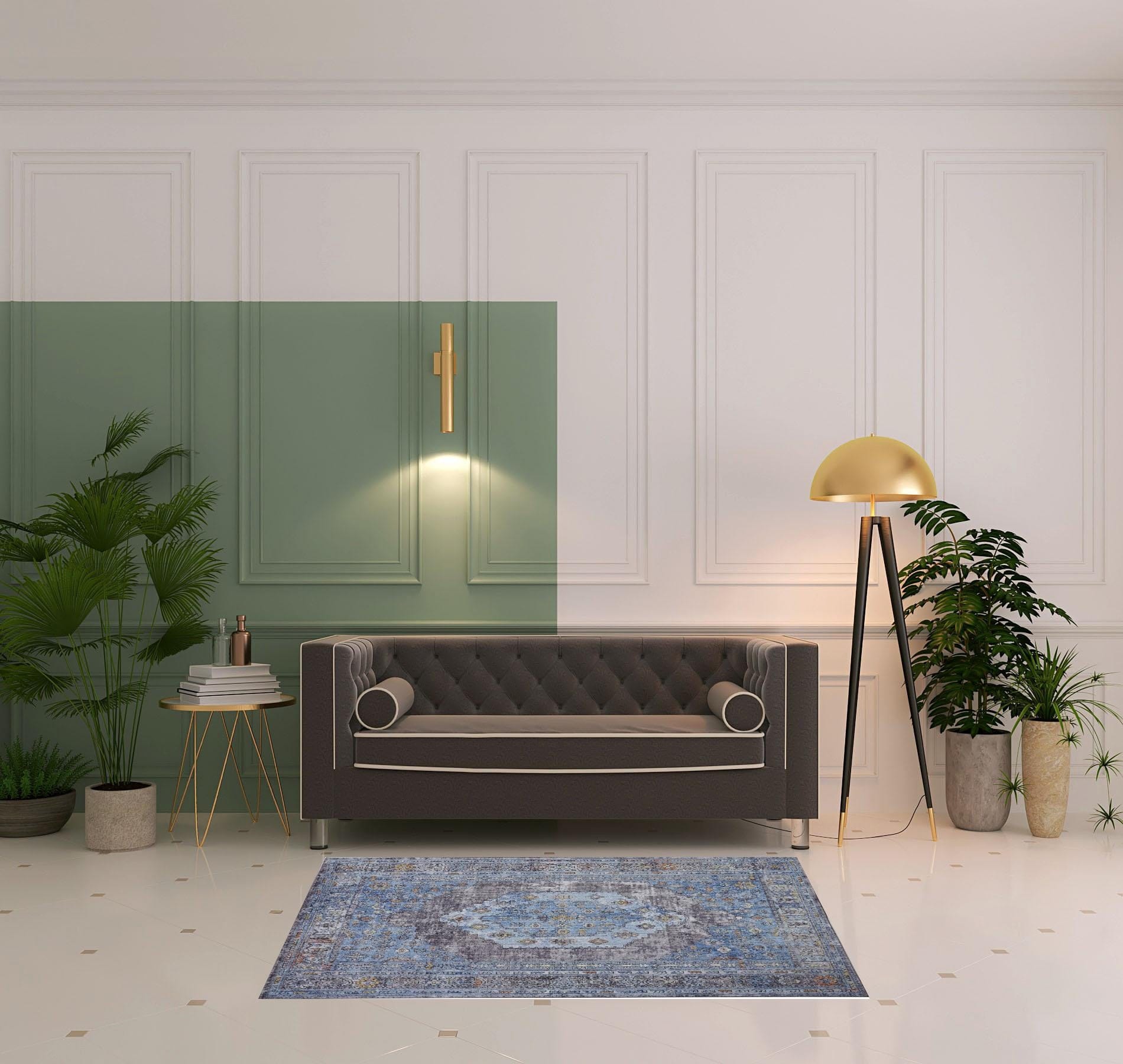 Set an inviting tone in your space with this 4' x 6' blue gray and gold floral stain resistant area rug. This rectangle shaped rug features a floral design in blue gray and gold to give it visual interest. A classic shape marries with good looking design for your space This superior Turkish rug represents the highest quality and is built to last. Ideal for spaces with kids and pets, this rug is stain resistant to help repel stains and spilled liquids. Place this area rug against a hardwood or tile floor and it will enliven your living space with style and sophistication. 0.59" H x 48" W x 69" D