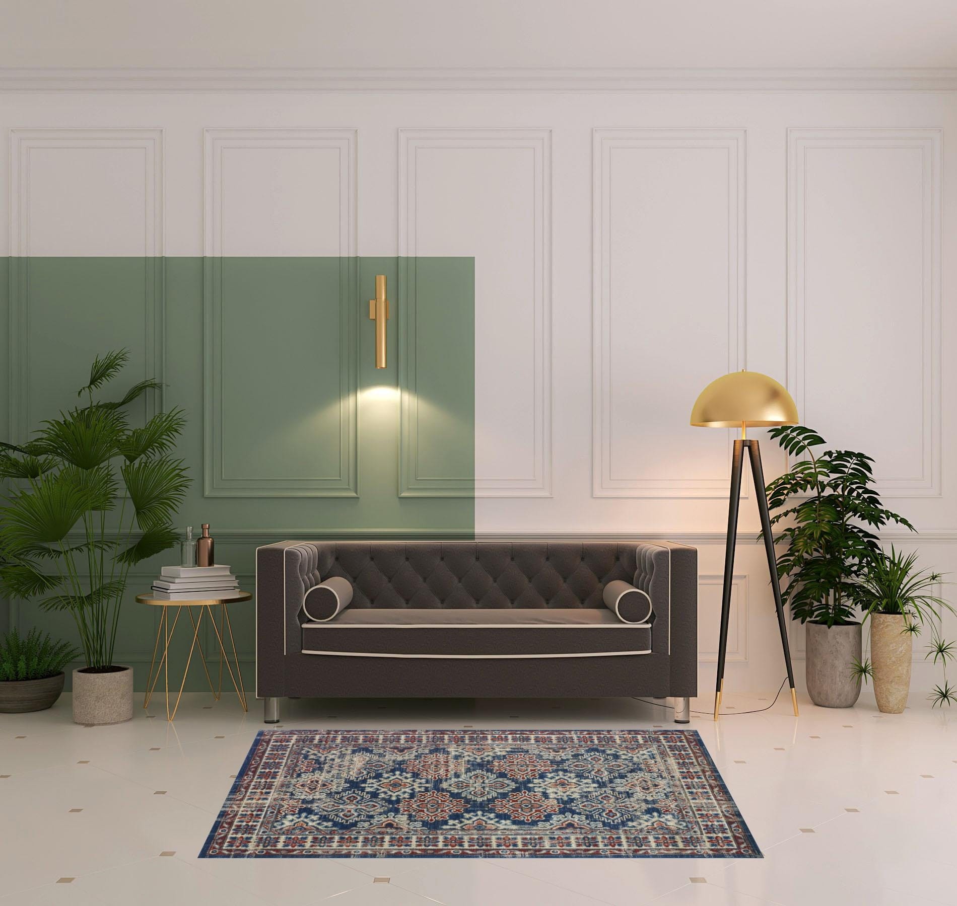 Add some artistry to your room with this 4' x 6' blue red and ivory abstract power loom distressed stain resistant area rug. This rectangle shaped rug features a abstract design in blue red and ivory to give it visual interest. A classic shape marries with good looking design for your space This superior Turkish rug represents the highest quality and is built to last. Ideal for spaces with kids and pets, this rug is stain resistant to help repel stains and spilled liquids. Area Rugs help to give warmth and sense of home to your space. 0.14" H x 51" W x 75" D