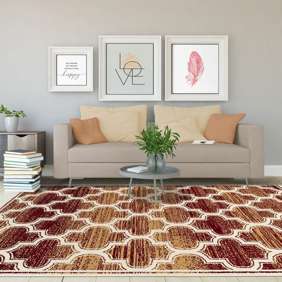 Add great coloration and comfortable texture to your space with this 4' x 6' brick and gold geometric stain resistant area rug. This rectangle shaped rug features a geometric design in brick and gold to give it visual interest. A classic shape marries with good looking design for your space Ideal for spaces with kids and pets, this rug is stain resistant to help repel stains and spilled liquids. Place this area rug against a hardwood or tile floor and it will enliven your living space with style and sophistication. 0.39" H x 48" W x 72" D